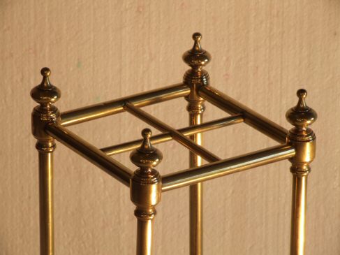A substantial heavy solid brass Victorian 4 section stick/umbrella stand with brass finials on cast iron base.