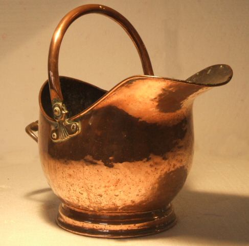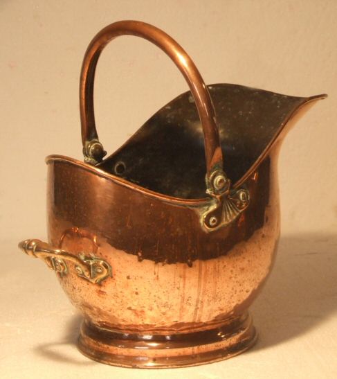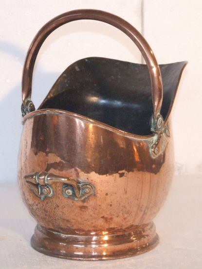 Georgian copper coal bin Attractive copper coal bin on circular base with heavy handle and supportive handle on the back to aid tipping the coal with ease. In excellent original condition will be polished prior to posting. Price £175 (Ref:MISC712)