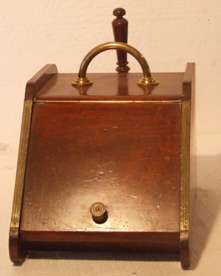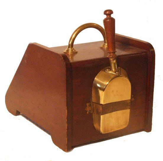 Edwardian mahogany coal bin An attractive and useful mahogany coal bin with sturdy brass handle and original brass shuvel. The front lid with reeded brass decoration and attractive brass knob handle opens to reveal a steel interior with handles to allow it to be removed and refilled easily. £235 (Ref:MISC714)