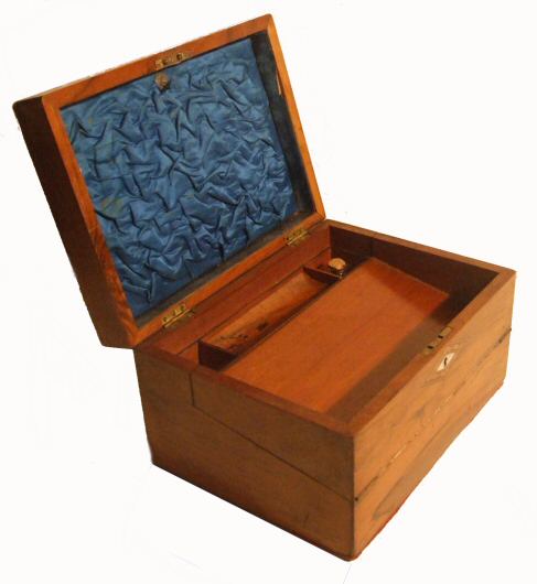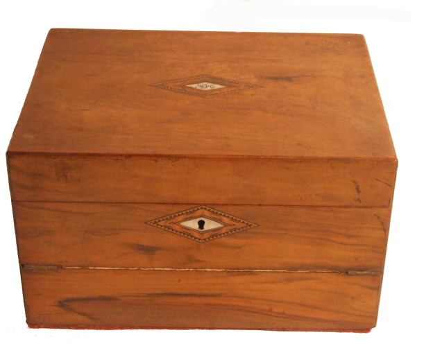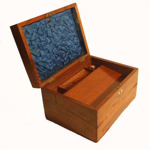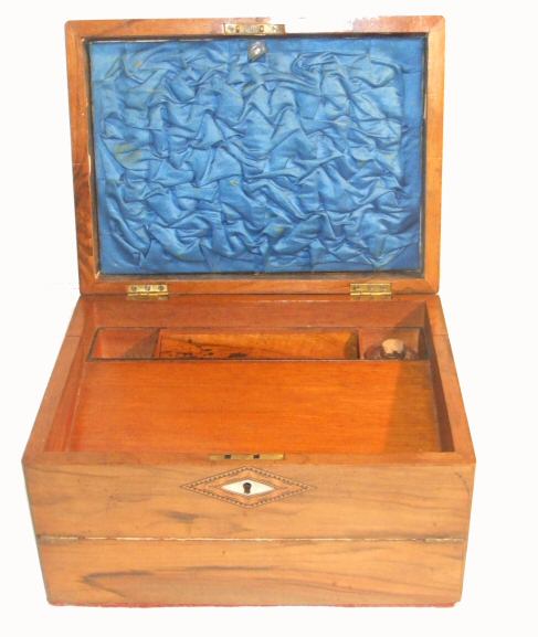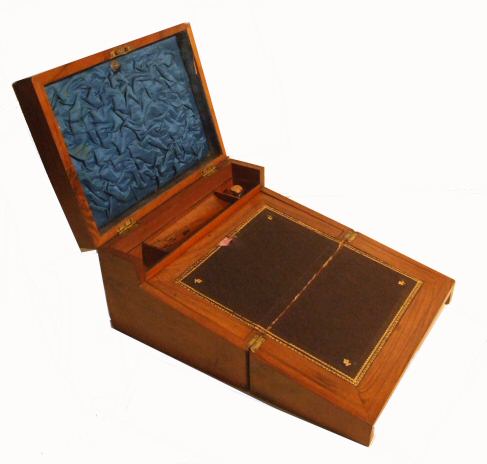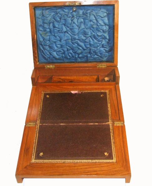 Victorian walnut writing slope An attractive and unusual example of a Victorian walnut writing slope. The lid being padded with blue silk is in original condition and opens to reveal a boxed area with pen support and glass ink bottle, this area then folds down to reveal a leather gilt tooled writing slope, the top of this lifts to open extra storage for envelopes or leteters. In excellent original condition with fully working lock and key. Width 12" Height 7" Depth 8.75" Price £295 (Ref:MISC726)