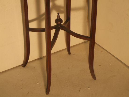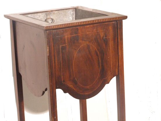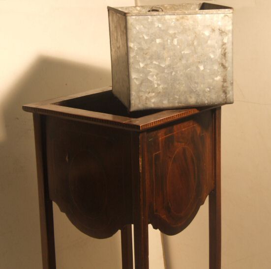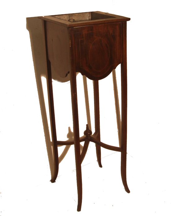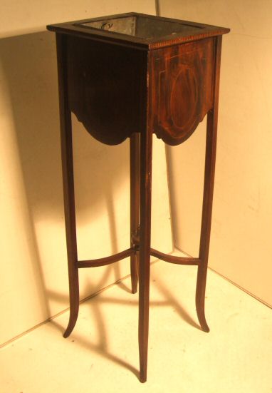 Edwardian inlaid mahogany jardinere An elegant and attractive Edwardian mahogany inlaid jardinere. This is particularly pretty and stands on elegant slender splayed legs with shaped stretcher and finial between for added strength. The body being of flame mahogany with inlay to all 4 sides and having the benefit of lift out original liner. A beautiful and elegant way to display a floral display. H 39" W 13.25" Price £395 (photos are pre workshop) (Ref:MISC775) Email Us for a delivery quote : Click Here
