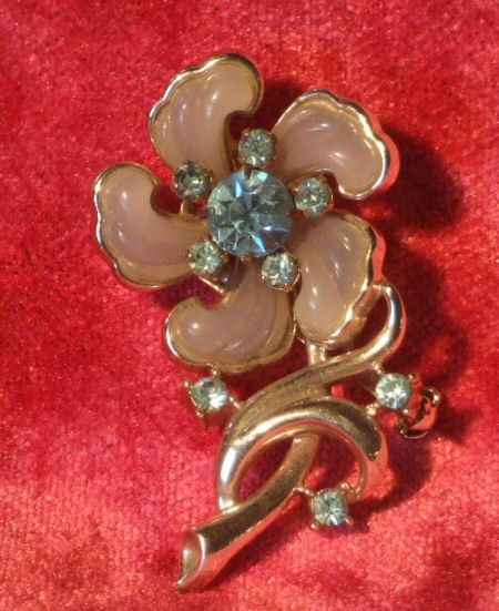 Gorgeous antique floral brooch A gorgeous antique brooch of flower with 5 pretty petals with central large crystal blue diamonte stone and 5 smaller outer stones with futher stones dressing the pretty silver colour stem. Gift boxed! Width 3cms Height 5.5cms £38 (Ref : MISC802) Email Us for a delivery quote : Click Here