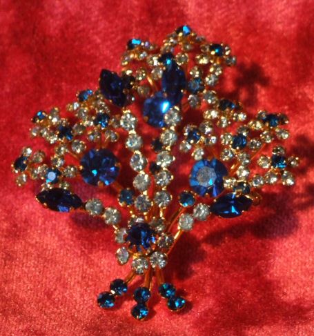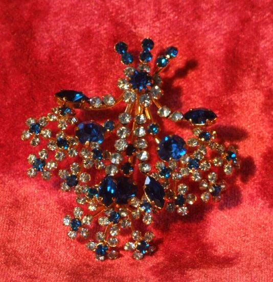 Large deep blue diamonte brooch A large and impressive deep blue floral brooch , the large central stones being a lovely sea blue and the actual petals of the flowers a gorgeous pale blue. Gift boxed! Width 6.5 cms Height 7 cms £28 (Ref : MISC803) Email Us for a delivery quote : Click Here