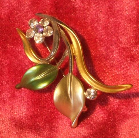 Dainty diamonte brooch A lovely antique diamonte brooch of a small 5 petal flower sitting on an array of leafs of various shades of green and gold. So pretty! Gift boxed! Width 3.5 cms Height 5 cms £28 (Ref : MISC806) Email Us for a delivery quote : Click Here