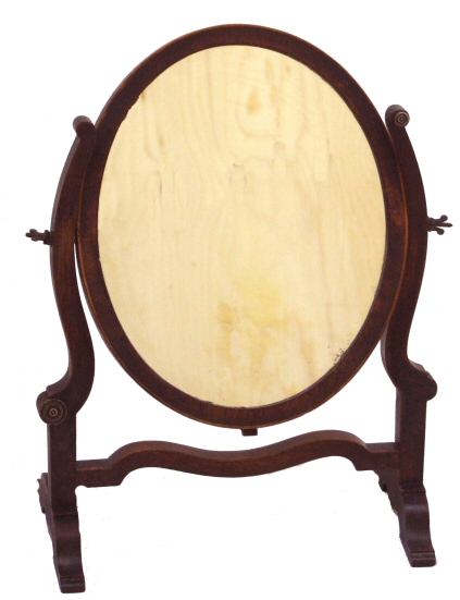 Edwardian mahogany dressing table mirror Of small proportions this lovely mahogany dressing table mirror dates to 1900 and is of skeletal form. The pretty feet supporting a scrolling frame which in turn supports a tilting oval mirror with line inlay to its exterior. A lovely and dainty mirror. Height 14.25" Width 11" Depth 6" (Ref :MIR50) Email Us for a delivery quote : Click Here