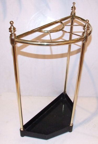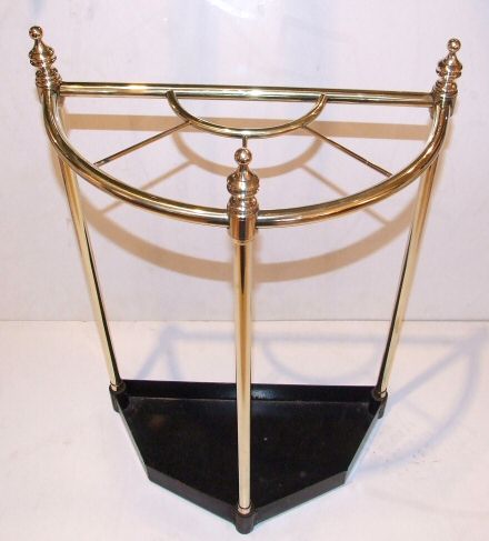 Edwardian Brass Stick Stand Circa 1900 this lovely semi circular brass stick stand has been fully buffed to enhance its wonderful condition. Having 4 sections around a further central section it provides excellent storage for sticks or umbrellas with 3 brass finials as decoration. Standing on a cast iron base which doubles as a drip tray it is a most attractive and useful piece of furniture. Height 25" Width 16" Depth 8" £195 (Ref : MISC109) Email Us for a delivery quote : Click Here