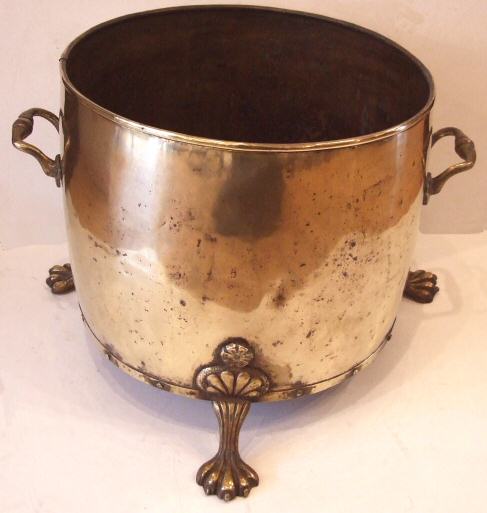 Early 20th century antique log bin Attractive polished brass large antique log bin standing on 3 well defined lion paw feet with large brass handles to either side. Very capacious and attractive. Height 15" Width 15" plus handles 6", total width 21" PRICE £195 (Ref:MISC128) Email Us for a delivery quote : Click Here