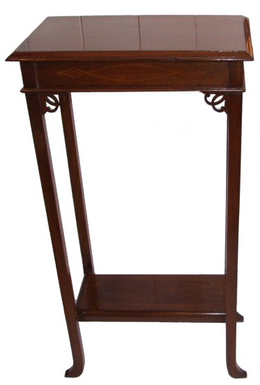 Attractive Edwardian mahogany inlaid plant stand A most useful Edwardian rectangular mahogany antique plant stand with inlaid top and under tier and elegant out swept legs. Pretty fret work under the frieze with line inlay to the top and frieze. The legs being very sturdy make this a highly useful and practical piece (Ref : MISC130) Email Us for a delivery quote : Click Here