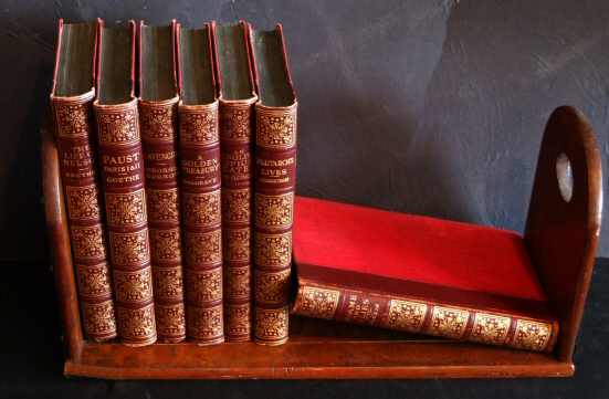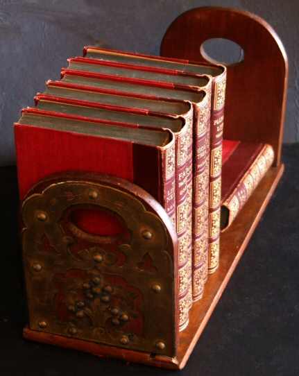 Extending Victorian mahogany and brass book ends A fabulous example of Victorian ingenuity, this extending mahogany book holder will take many books, the ends having substantial brass hinges which allow the ornate demi lune ends to rise and fall according to use. The base is baize lined and the outer ends decorated with pierced brass . A wonderful and useful piece of antique furniture ideal for use in any room. Photographed prior to being extended. Width 12.5" min, 24" max Height 6" Depth 5" Price £125 |