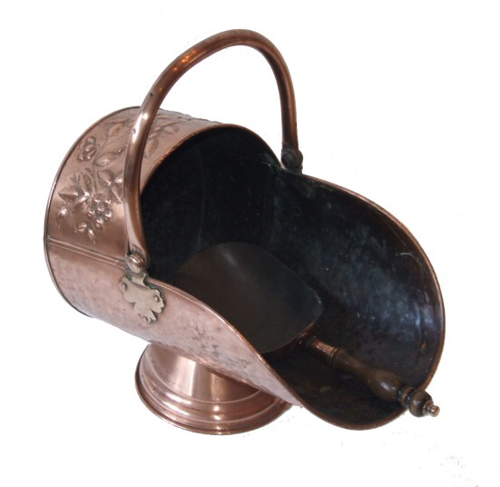 Beautiful embossed Victorian coal skuttle A lovely example of a Victorian copper coal skuttle with copper shuvel. This particularly pretty example is of helmet design with flowers and leaves embossed on its body. Of good proportions and being very sturdy this will prove a very useful and attractive item to dress a fireplace. SOLD Ref:MISC231 Email Us for a delivery quote : Click Here