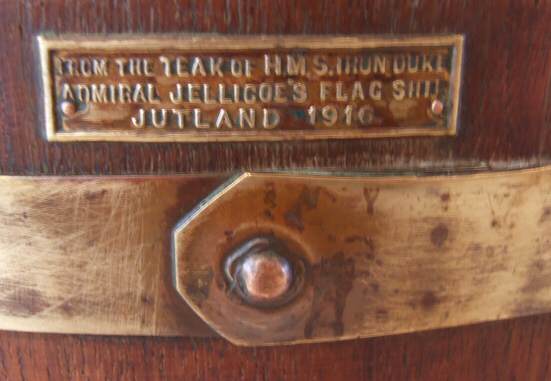 A wonderful coopered Fruit Bowl This wonderful fruit bowl is made as the plaque mentions "from the Teak of HMS Iron Duke Admiral Jellicoes flagship JUTLAND 1916. The brass bound coopered log bowl is extremely useful and what a history! Width 11" Height 4.5" £95 (Ref : MISC98) Email Us for a delivery quote : Click Here