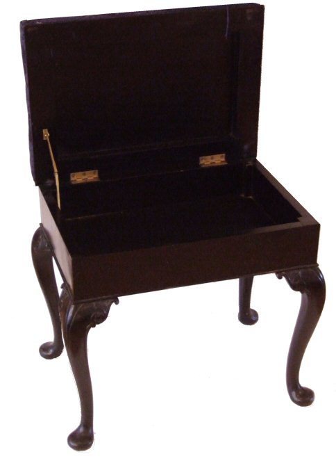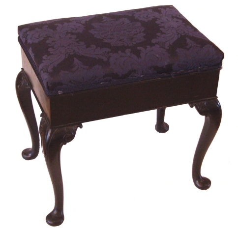 Circa 1920 Ebonised piano stool This pretty stool dates to 1920 and stands on cabriole legs with accanthus detailing to the knees and pad feet, the seat is hinged to reveal useful storage for music and we are happy to recover this in a material of your direction.