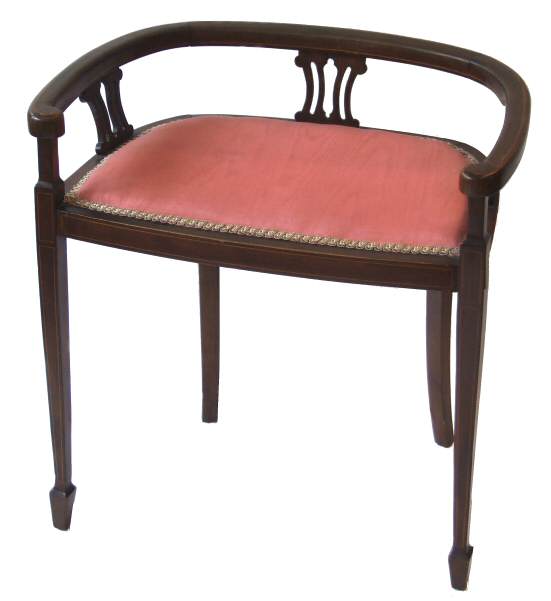 Edwardian mahogany demi lune piano stool Attractive inlaid mahogany piano stool on slender tapering legs with spade feet. The upholstered seat having a small curved support again with line inlay. Pefect for use as a piano stool or elegant dressing table stool. £245 Width 23" Depth 15" Height 19" to seat 23.5" to top of frame
