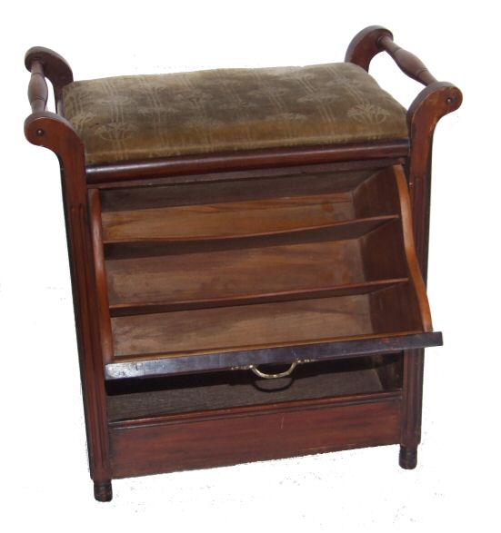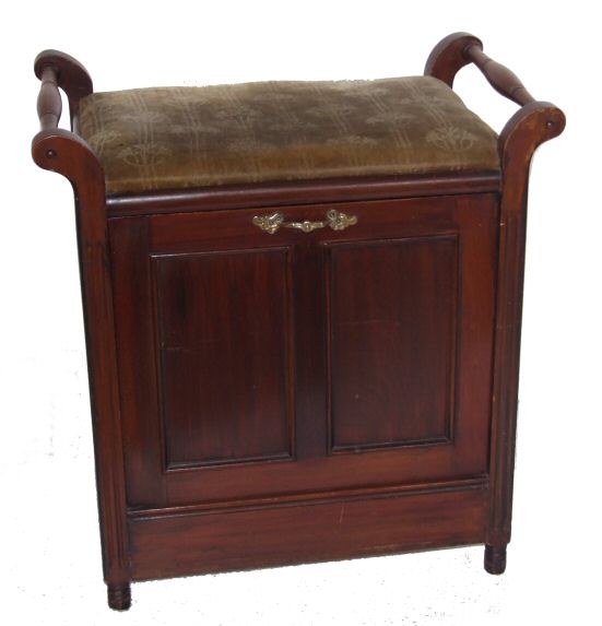 An Ewardian piano stool with drop in seat (can be recovered) and drop fall to enable the storage of music.