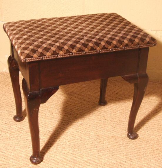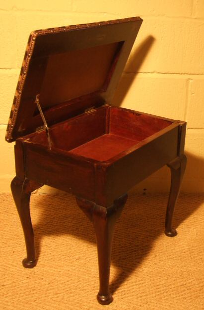Circa 1920 antique piano stool Circa 1920 an antique mahogany piano stool with lift up lid to store music in patterend brown velvet, used by in good condition. The whole supported on cabriole legs with pad feet. H 19" W 20.25" D 14" Price £95 (Ref:PIA31)