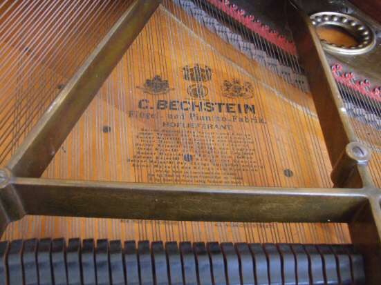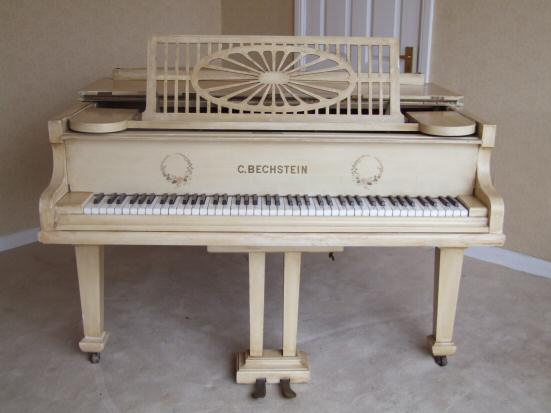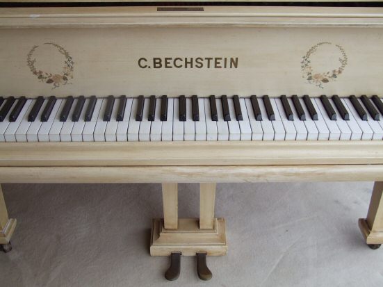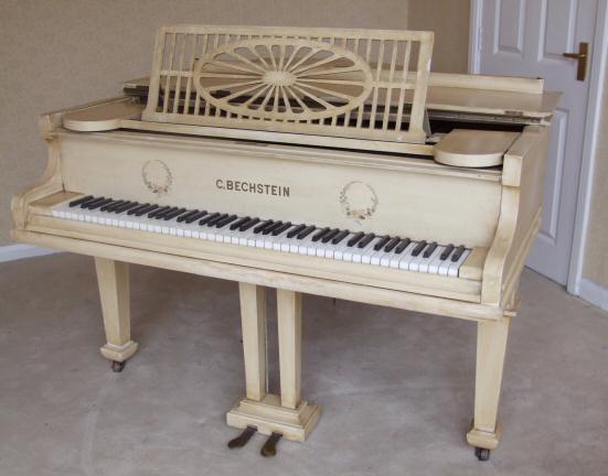 Beautiful Bechstein Boudoir Grand Piano Something totally unique is this lovely Bechstein boudoir grand piano, the whole case having been painted in cream with an antique distressed finish make this perfect for all styles of home even the most modern. Dating to aprox 1920, ( to be confirmed) this is beautiful piano, iron framed, overstrung, concert pitch and really lovely to play. It is receptive and bright to the touch, internally in beautiful condition with very little wear to the hammers and felts. I have played this piano and feel it is one of the nicest in tone and touch that we have had for a long time. Under the painted exterior is a mahogany frame so if the finish isnt to your liking you can always have it stripped and traditionally French polished but you are buying it at an unbelievable price which allows you to do this if you so wish. The whole supported on 3 tapering legs with brass casters. The music fret has oval fretted central panel within a rectangular frame. You certainly wont be disappointed with this. Dimensions to be confirmed.