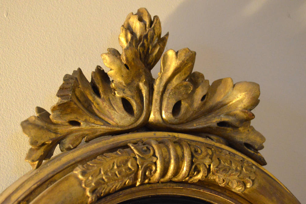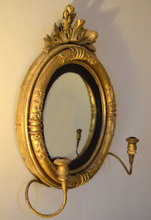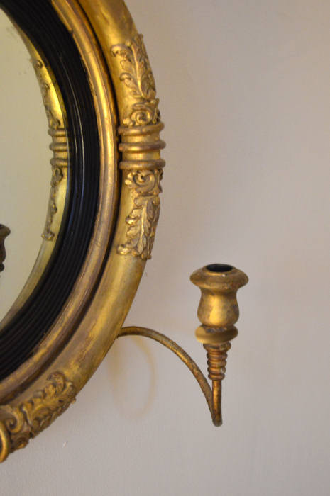 Twin Arm Regency Period Convex Girondle Mirror Dating to the Early 19th Century, this stunning example features a circular frame in relief, adorned with foliate detailing, holding within a convex mirror in superb condition. Again bordered by an ebonised reeded slip. To either side are candle holders, for decoration now, originally the main light source! Finally, the whole surmounted by a really gorgeous foliate pediment. A good size, not too massive, therefore it can be used for many applications within the home to add real class and character to any unexpected area! Height 23" (585mm) Width 19.5" (490mm) Depth 5.5" (135mm)