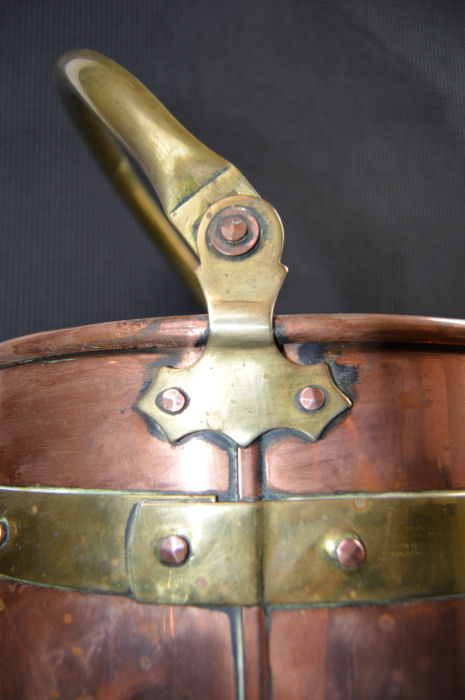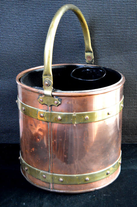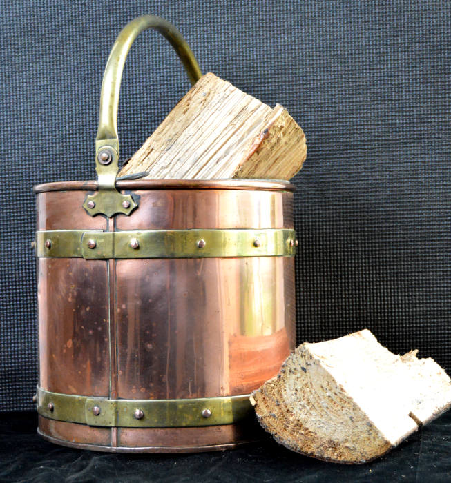 19th Century Brass Bound Copper Coal/Log Bin A 19th Century brass Bound Copper Coal/Log Bin. This lovely example, cylindrical in shape, features 2 thick brass bands with decorative copper studs. A strong brass handle with an internal lift out steel liner all in excellent condition. H 10.25" bucket but 17.5" with handle Width 11" |