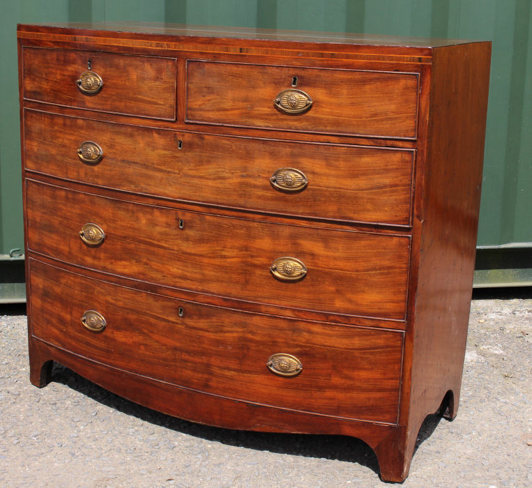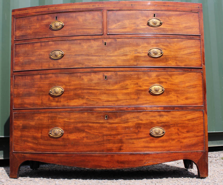 Georgian Bowfronted Mahogany Inlaid Chest of Drawers Early 19th Century mahogany bowfront chest of drawers of small proportions.Dating to the Regency period this lovely chest features a shallow bow front with brass oval drop handles each embelished with a lion mask. The drawers are mahogany lined and cock beaded and all run smoothly. Across the front at the top is some vertical banding in tulip wood between 2 lines of stringing and the whole raised on bracket feet. A very nice original chest, golden honey in colour (not too dark!) This size lends itself to perhaps lounge or hallway aswell as bedroom. Height 36.75" (930mm) Width 41.5" (1053mm) Depth (front to back) 19.75" (503mm)