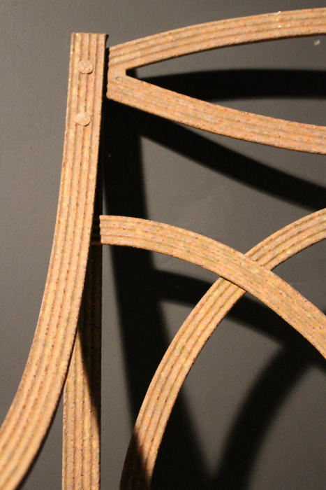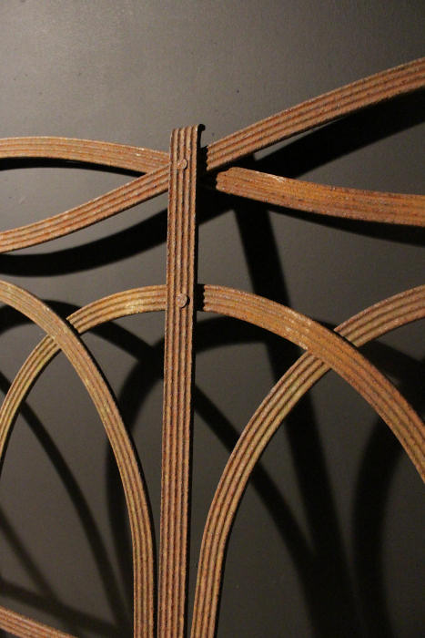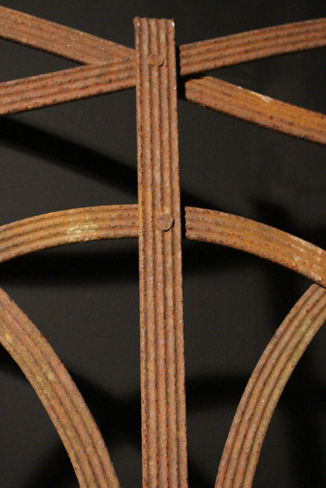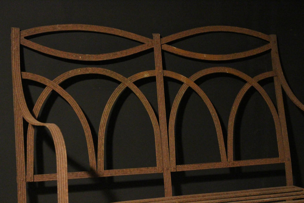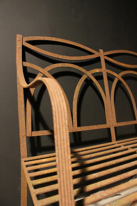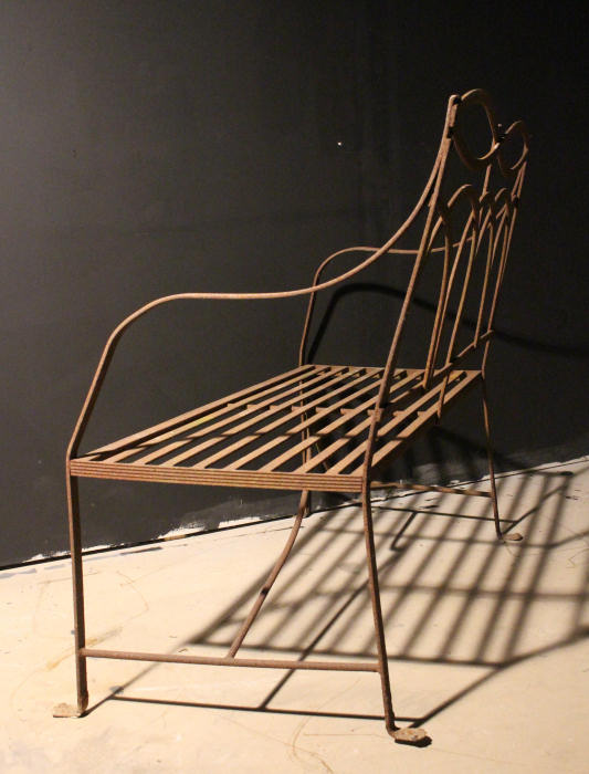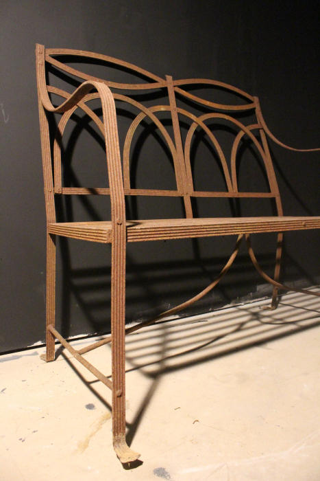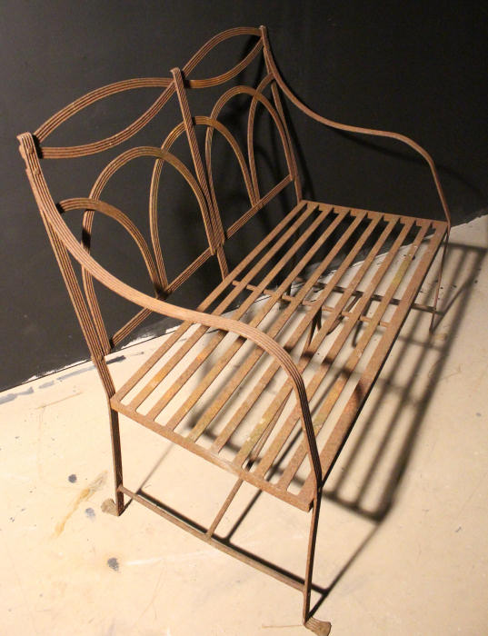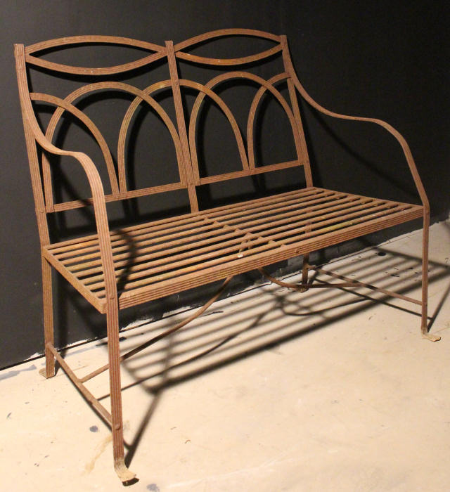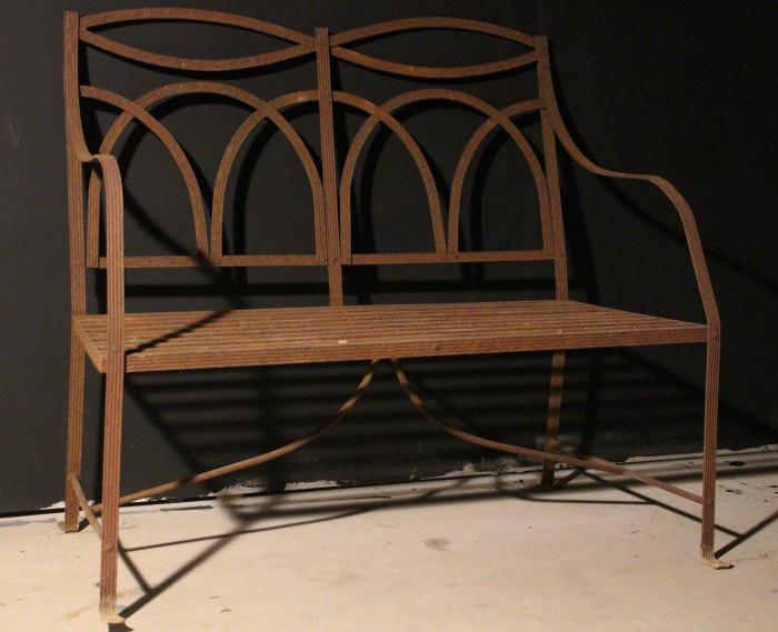 A Regency Iron Garden Bench, "reeded" flat strapwork design featuring very attractive eliptic and full arch patterns. The whole raised on lion paw feet utterly original. Very Rare!