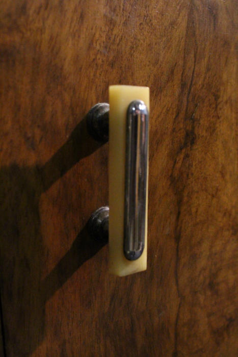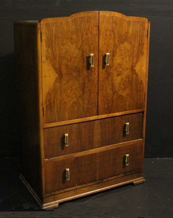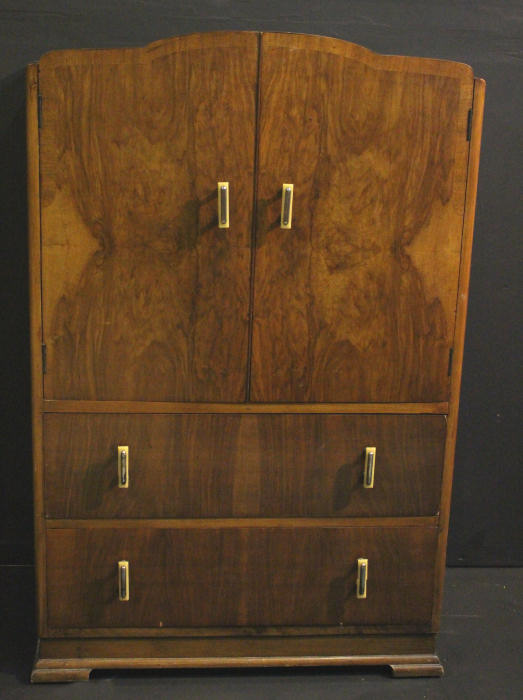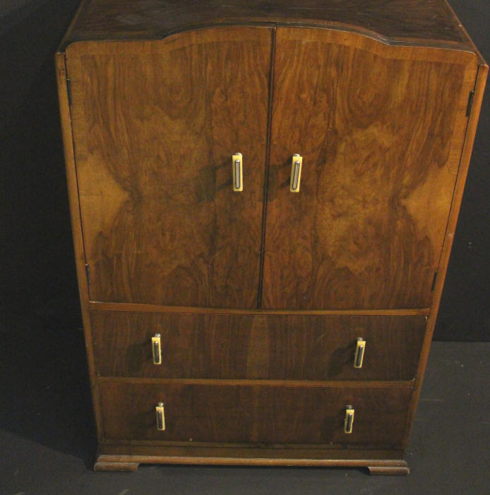 Art Deco Skyscraper Cabinet A lovely item, this Art Deco Cabinet of small proportions if perfect for spaces where storage is at a premium. The 2 doors at the front open to reveal a shelved interior, with 2 drawers below. The walnut is a lovely warm colour and the handles attractive and original to the piece. Height 119cm Width 76cm Depth 46cm