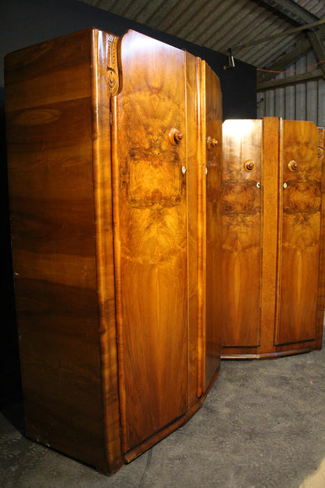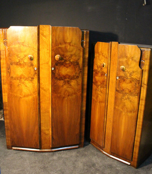 Large Art Deco 2 Door Figured Walnut Wardrobe A large 2 door figured walnut Art Deco wardrobe. This capacious wardrobe has 2 door which open to reveal full hanging both sides with shelf above. A warm figured walnut with unusual handles. I have 2 matching wardrobes and this is the larger of the 2. Representing excellent value for money. Width 48.75" Depth 26" Height 75" Price £245 Delivery £75 (based on one man and van service) SAF61