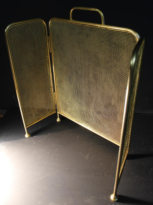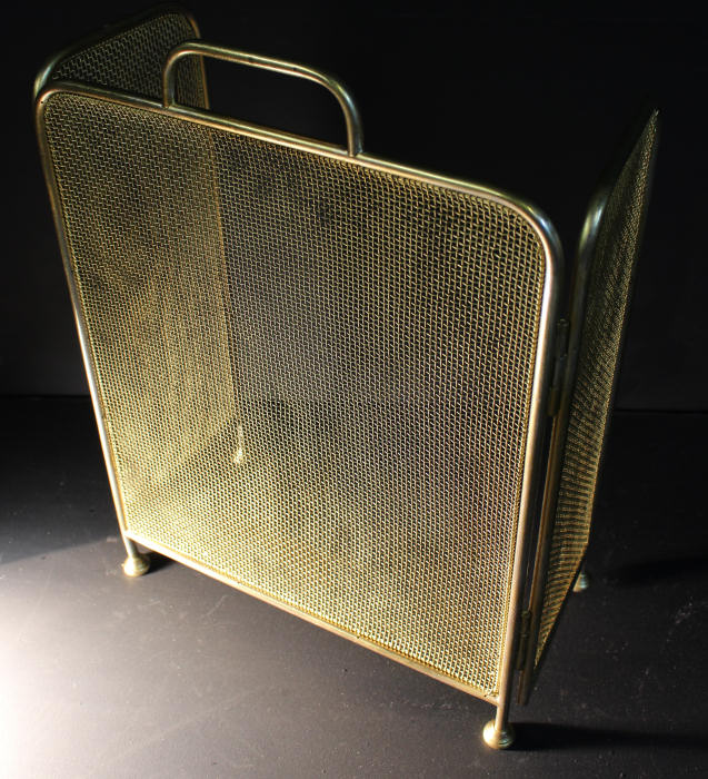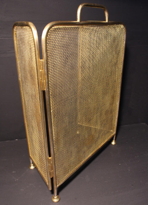 Edwardian Brass Triple Folding Firescreen This lovely Firescreen dates to circa 1900, the mesh is in excellent condition. Folds neatly for storage when not in use. Standing on pretty brass feet with sturdy brass handle. This lovely fire screen is nicely patinated with slight wear from use. A lovely item and getting hard to find. Depth 8" Height 21.25" Width 16" |