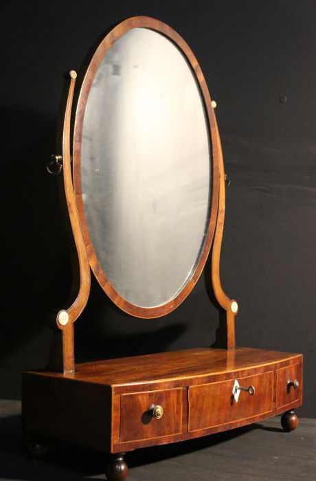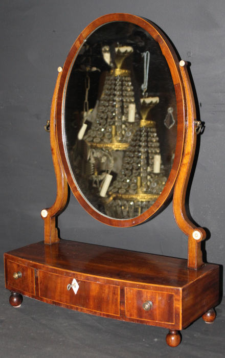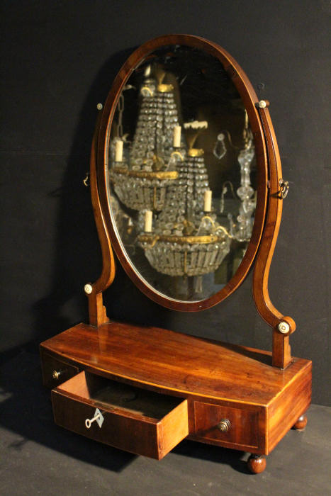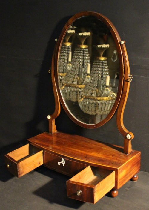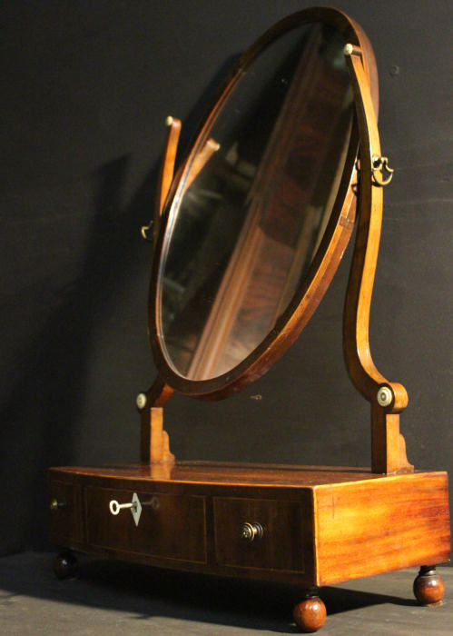 Regency Mahogany Inlaid Dressing Table Mirror This gorgeous example features 3 drawers within the shallow bowfront, the central drawer having a diamond shaped ivory key escusion with working lock and key. This drawer is flanked by 2 smaller drawers each with gorgeous little Regency Lion Mask brass drawer pulls. Above is a mirror of oval outline contained between 2 supporting attractive shaped arms with further ivory embelishements. The whole piece is bordered with gorgeous contrasting boxwood stringing to the borders and finally raised up on dainty bun feet. A lovely way to store rings and watches etc. Mirror tilts and locks in position via the drop handles either side so it wont keep flopping down. Height 26.5" Width 18.5" Depth 8" Ref SAF71 Price £375 Delivery £15