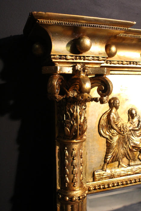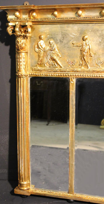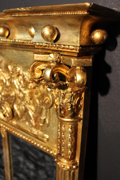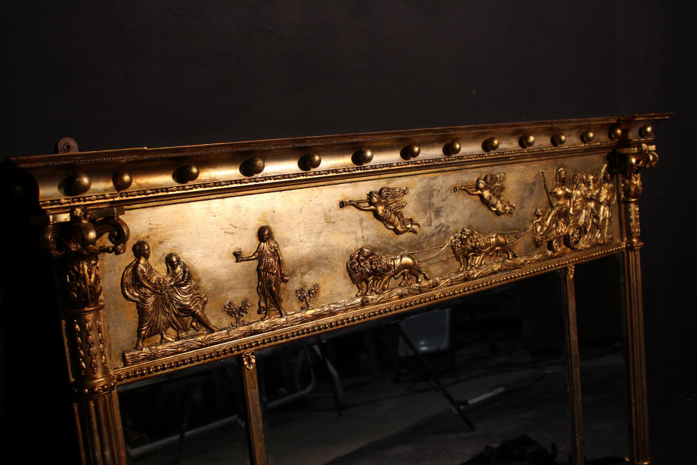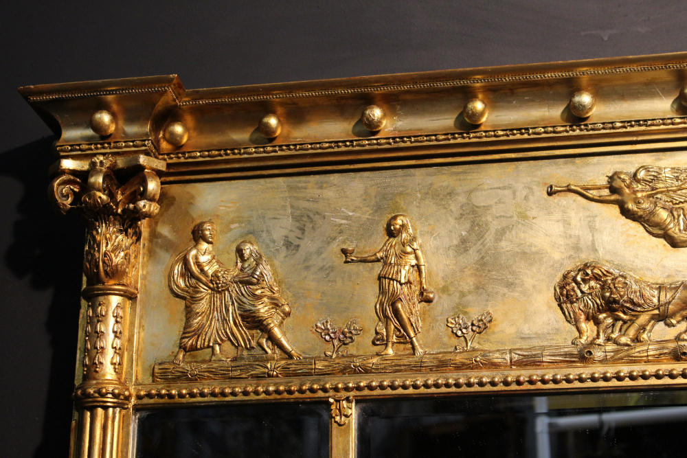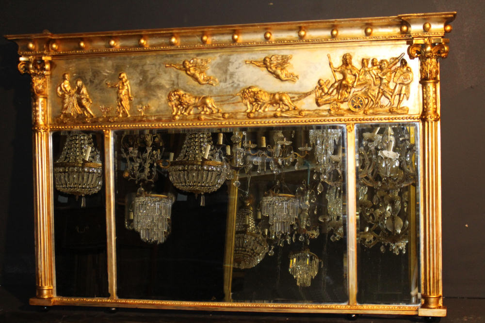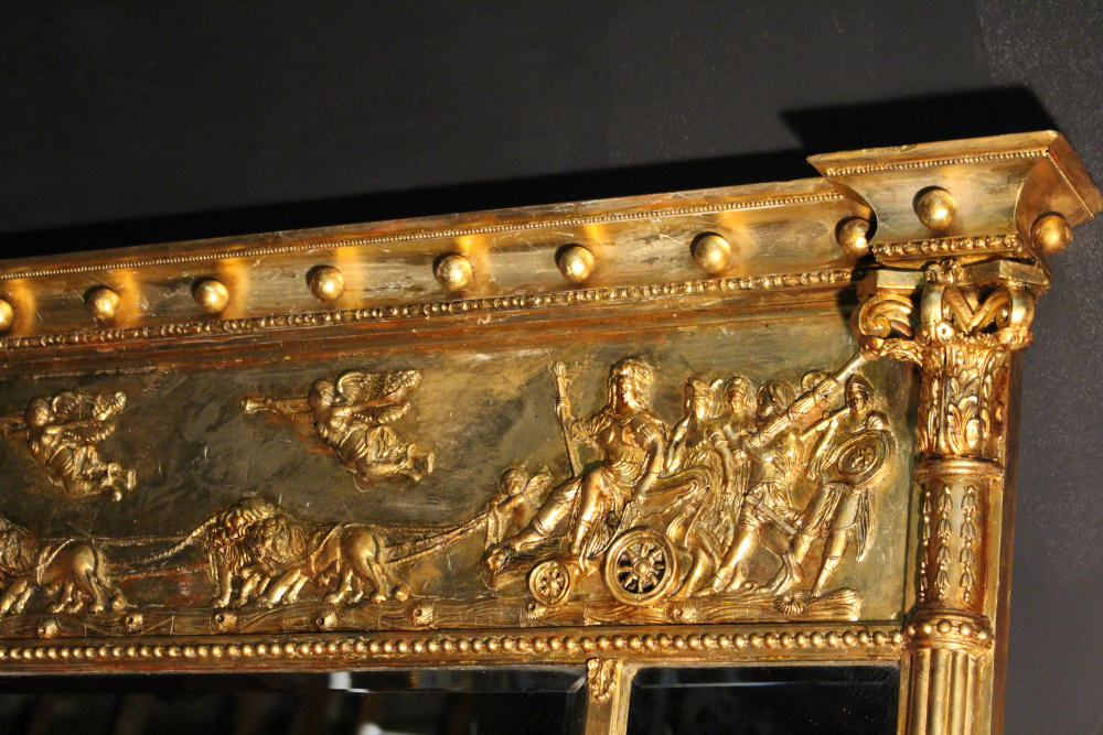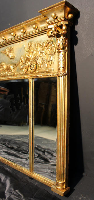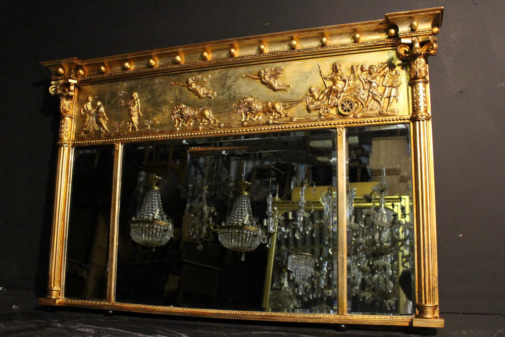 Regency Triple Plate Gilt Overmantle Mirror Gorgeous Regency Triple Plate Overmantle mirror. The 3 bevelled mirrors (excellent condition) contained within a gilded frame and flanked by fluted pillasters terminating in gorgeous accanthus leaf capitals. To the top is a frieze in shallow relief of a Roman Chariot being pulled by lions which we think is the procession of Jupiter. The whole surmounted by an inverted brake front cornice adorned with gilded balls (typical of this period) Lovely item in excellent condition Height 90 cms Width 140.5 cms Depth 11 cms