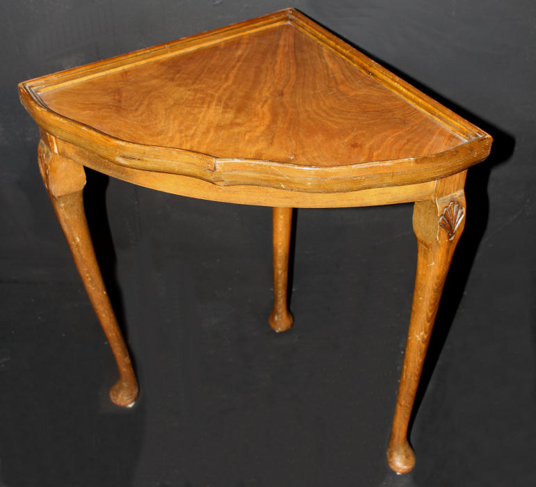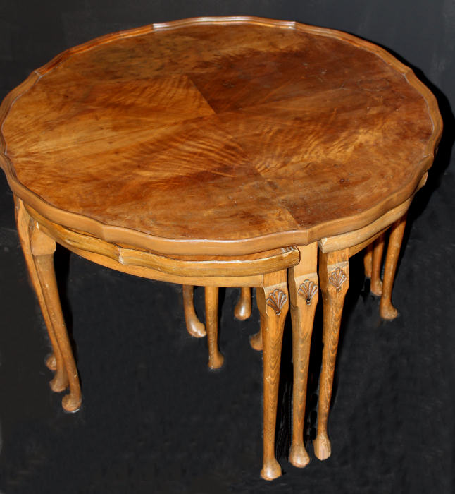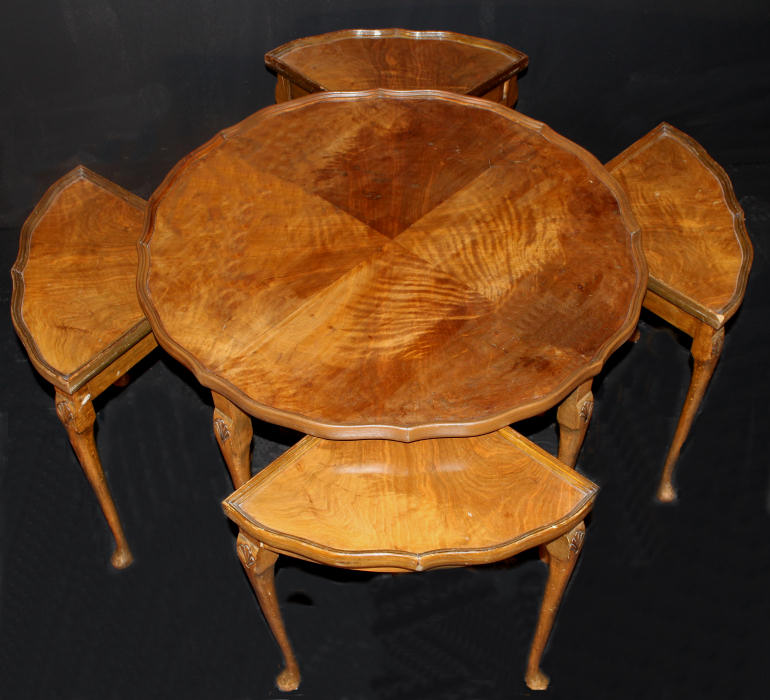 Circa 1920/30 Blond Figured Walnut Art Deco Quartetto of Tables Dating to Circa 1920/30 this Art Deco Quartetto of tables are a lovely blonde colour and have highly figured walnut to their tops, extremely practical, aswell as beautiful. A fantastic size, the top table is circular with pie crust edging with quarter bookpaged figured walnut top, and there are 4 triangular tables that fit snuggly below offering so many applications for use in a lounge. Wonderful for when extra guests arrive and need somewhere to put their wine glass! Price £550 Delivery £45 (man and a van, but please confirm your delivery address for a definite figure on these tables) SAF74