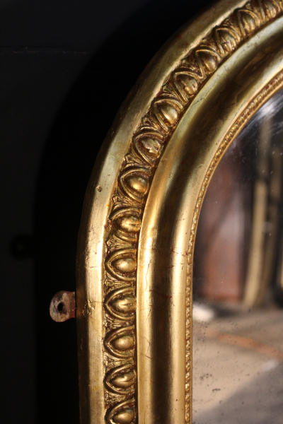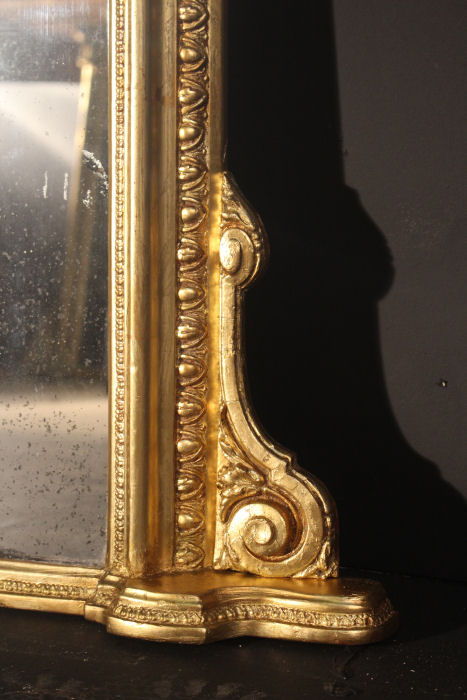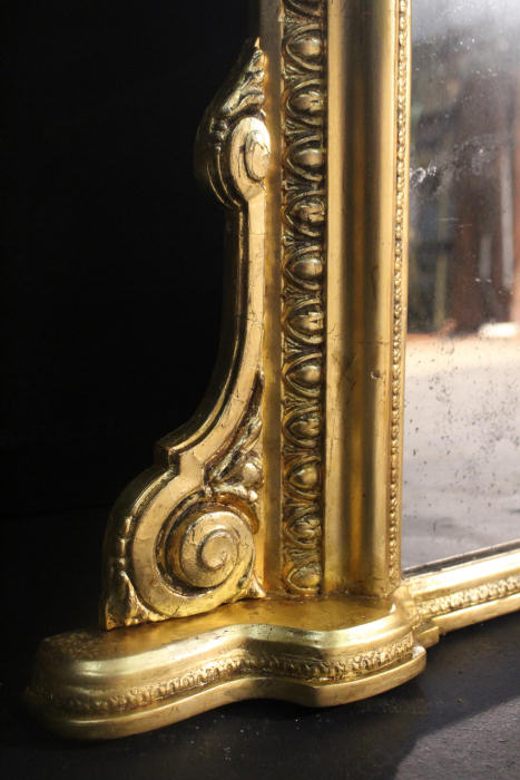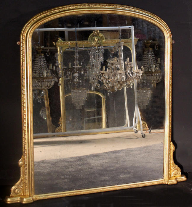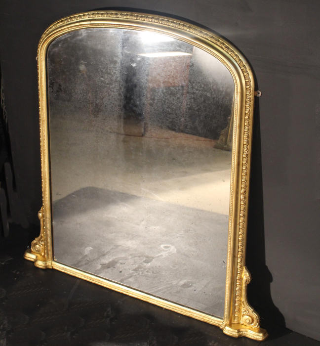 Victorian Gilt Arched Overmantle Mirror A gorgeous 19th Century Victorian Overmantle Mirror, original mercury plate mirror contained within a moulded gilt frame, lovely detailing, flanked by scrolling supports. The mirror is very atmospheric and characterful having extensive foxing and speckling and will look like its been over your fireplace for the last 150 years. Height 52.25" Width 54" Depth 3.25"