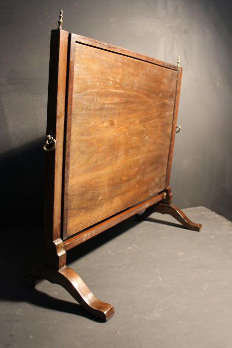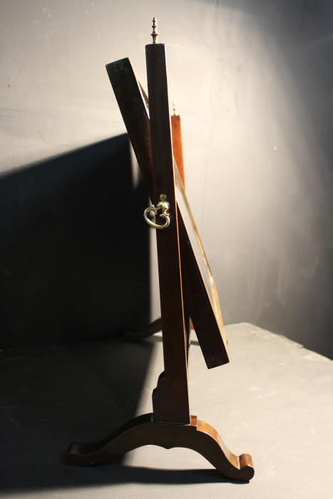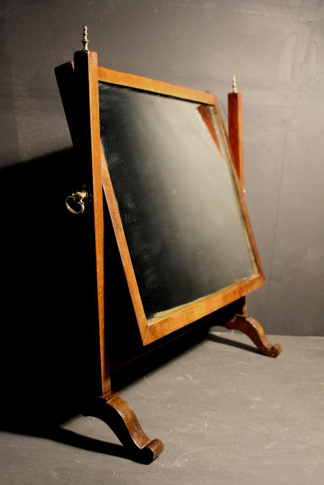 Edwardian Mahogany Dressing Table Mirror Slightly reclined mahogany swing toilet mirror. Circa 1900 a lovely Edwardian tilting mirror held between two uprights each with adjusting handles to get the "perfect" tilt, each surmounted by fine brass finials. Fielded mahogany back and original glass. Very good condition