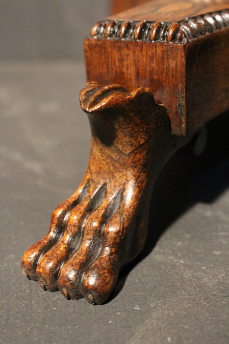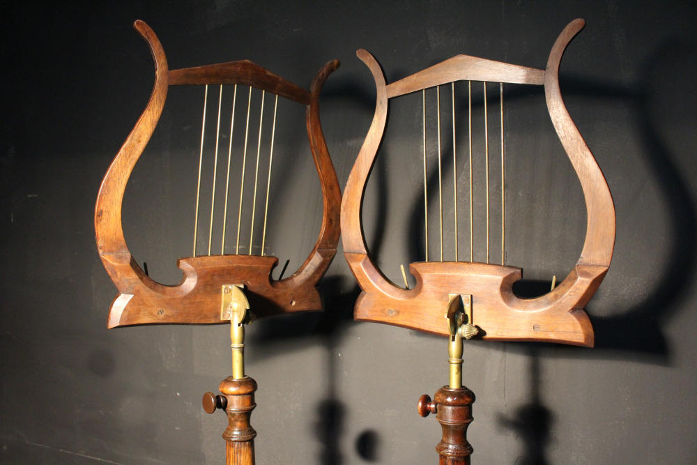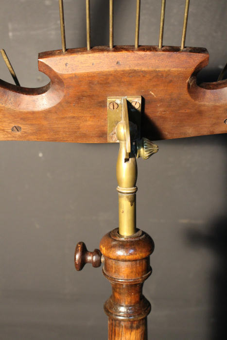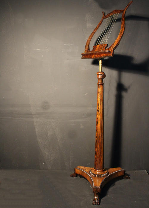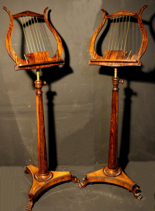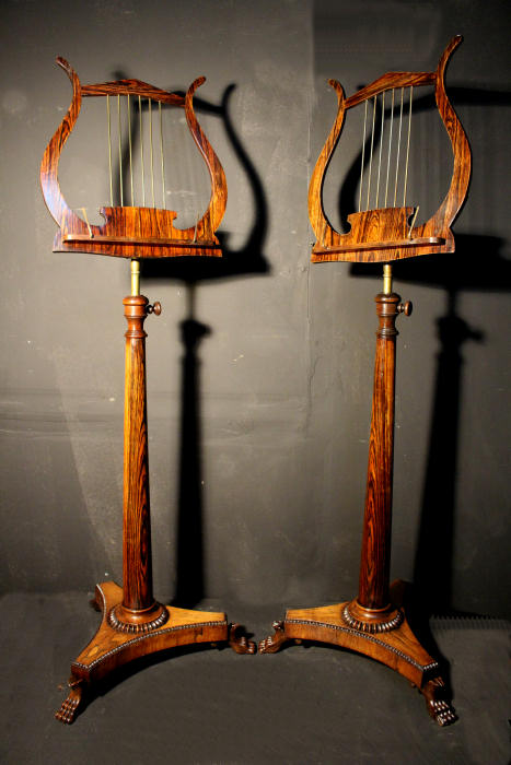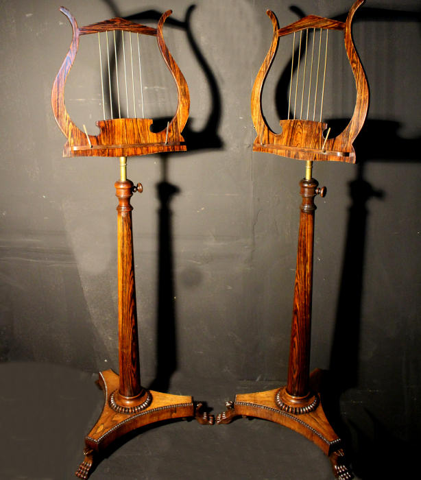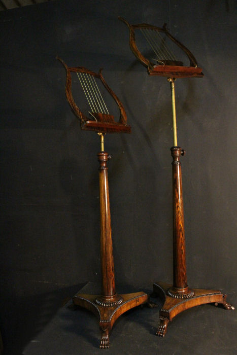 Extremely rare pair of matching Regency Rosewood Music Stands in excellent original condition with no repairs or alterations. Fully adjustable, these extend and tilt beautifully making them wonderfully useful but also extremely collectable. The trifoil base has wonderful small well defined lion paw feet with gradrooning above and this can also be found at the base of the stem. The music stand itself is in the shape of a lyre with brass catches and central panel of 5 brass rods to support the music. These are in stunning original condition and will make a fantastic investment.