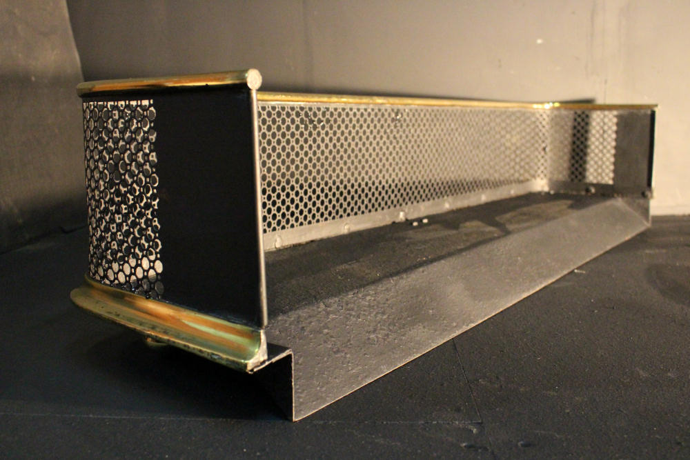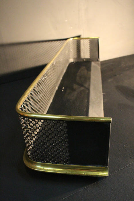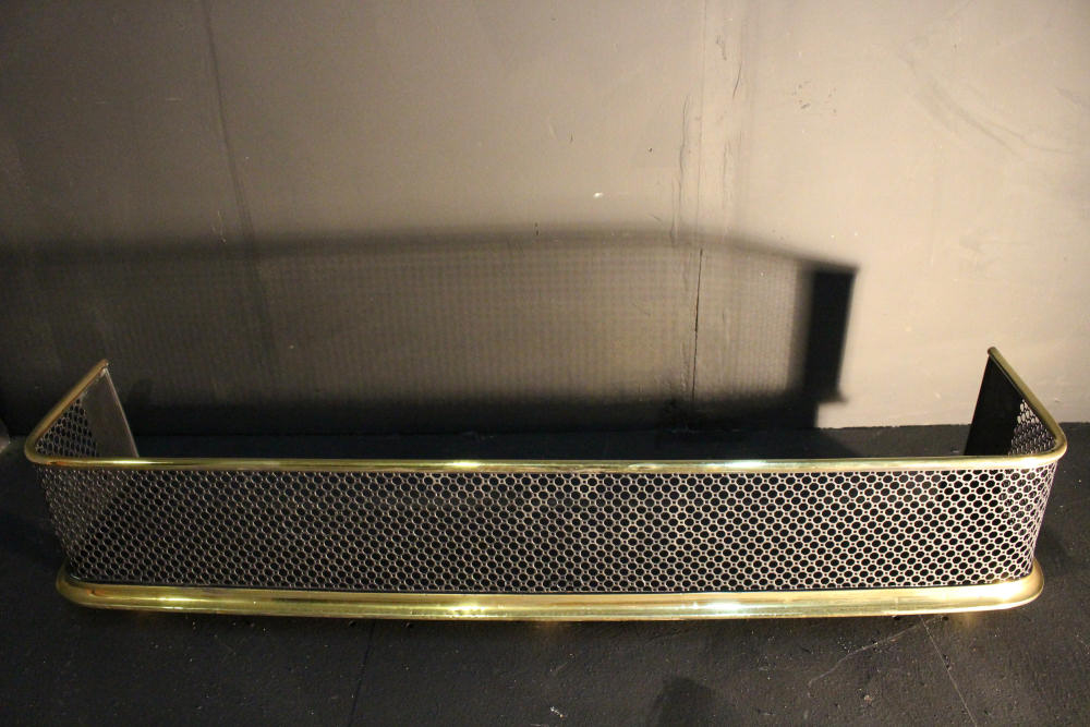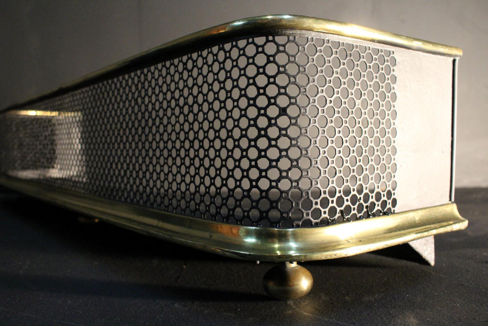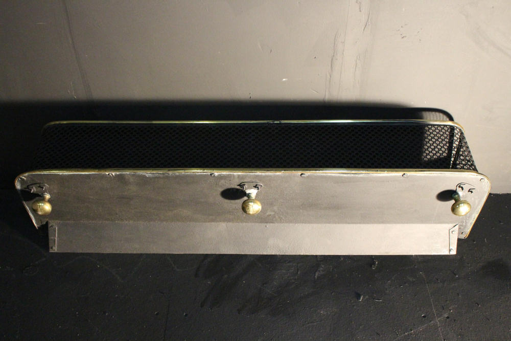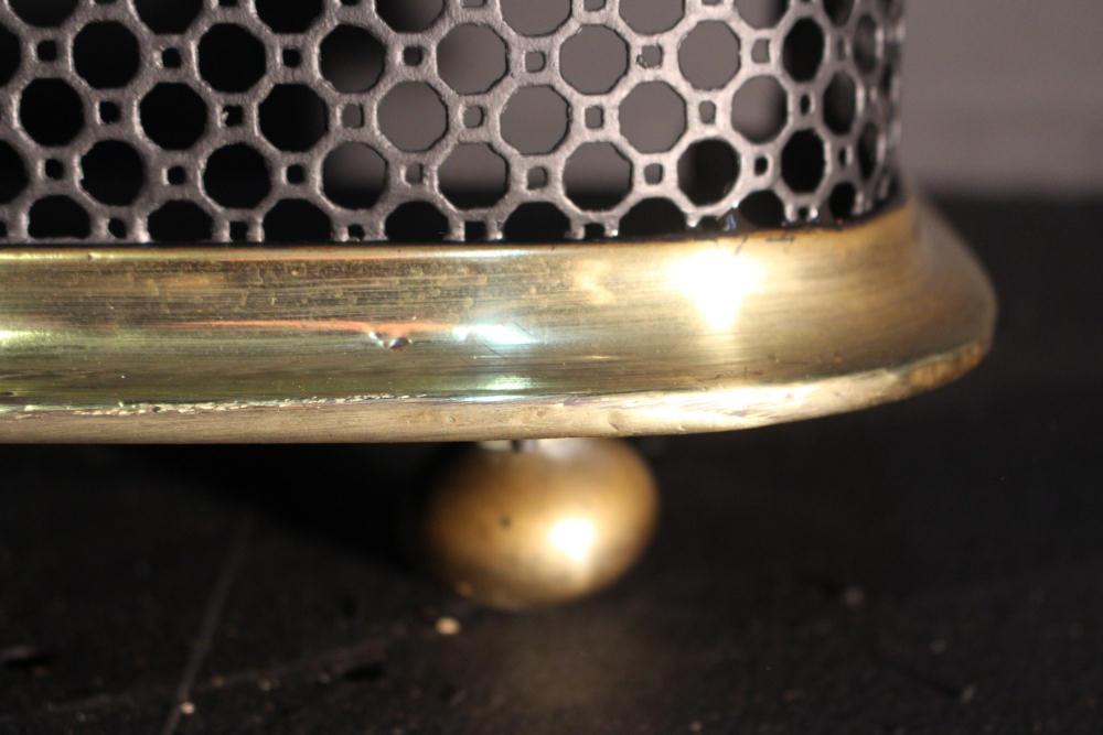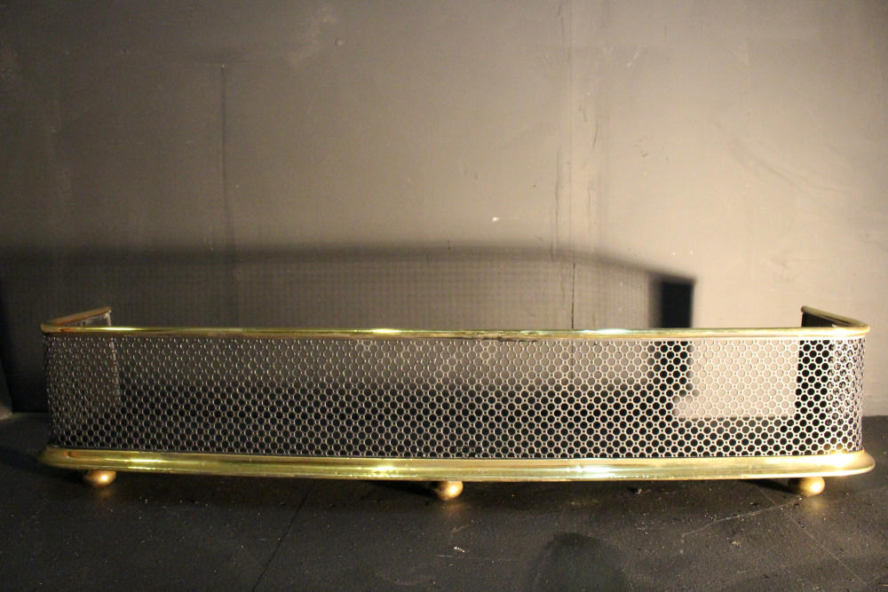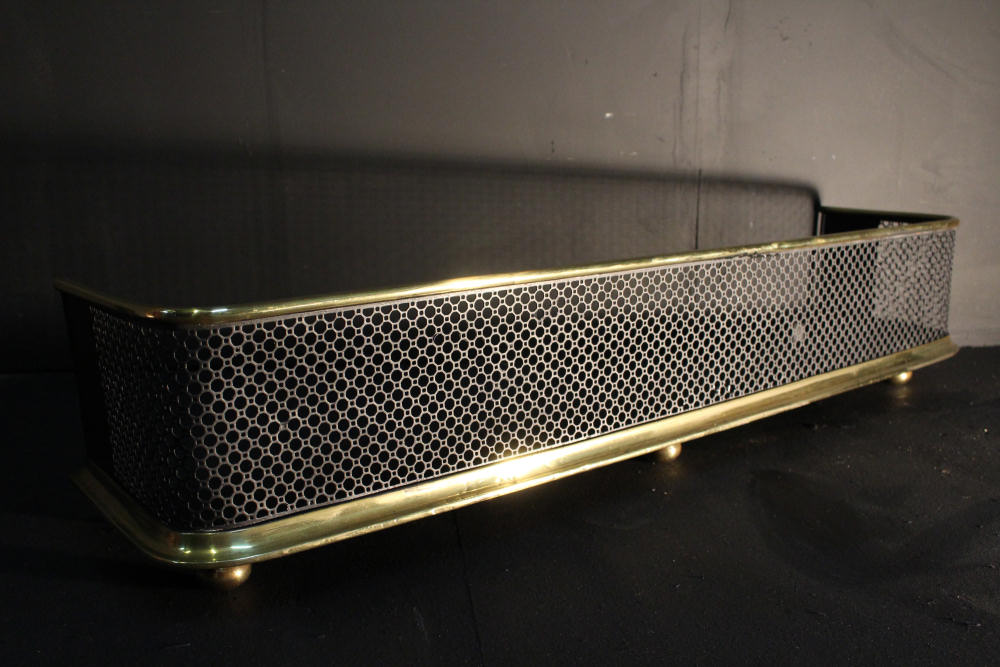 Regency Brass Fender Dating to the Early 19th Century this Regency fender features steel mesh intertwoven in excellent condition. Below a steel base which helps catch sparks flying from the lit fire. The whole surmounted by a solid brass rail top and bottom. To the front are 3 original show ball feet in brass raising it slightly to add grandeur. Brass trim above and below complete its lovely look. Width 43.25" Depth 10" Height 9.25 |
