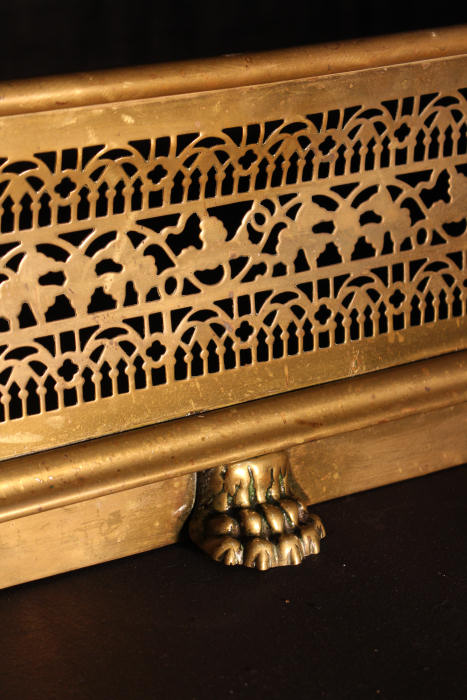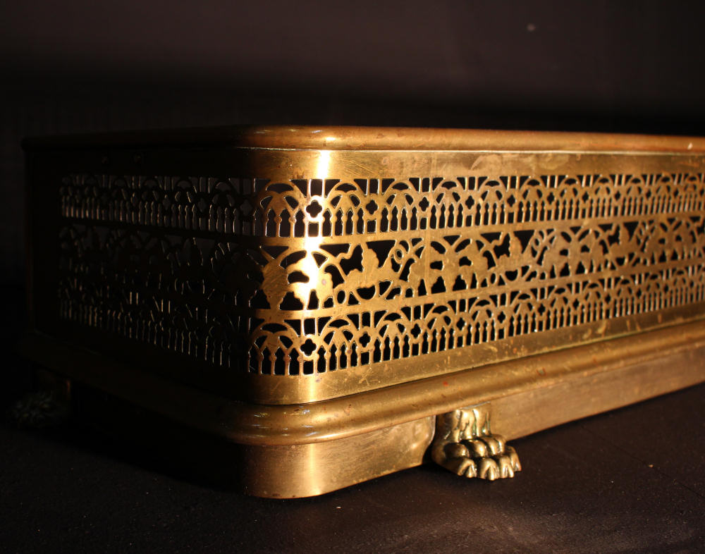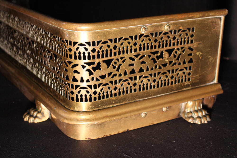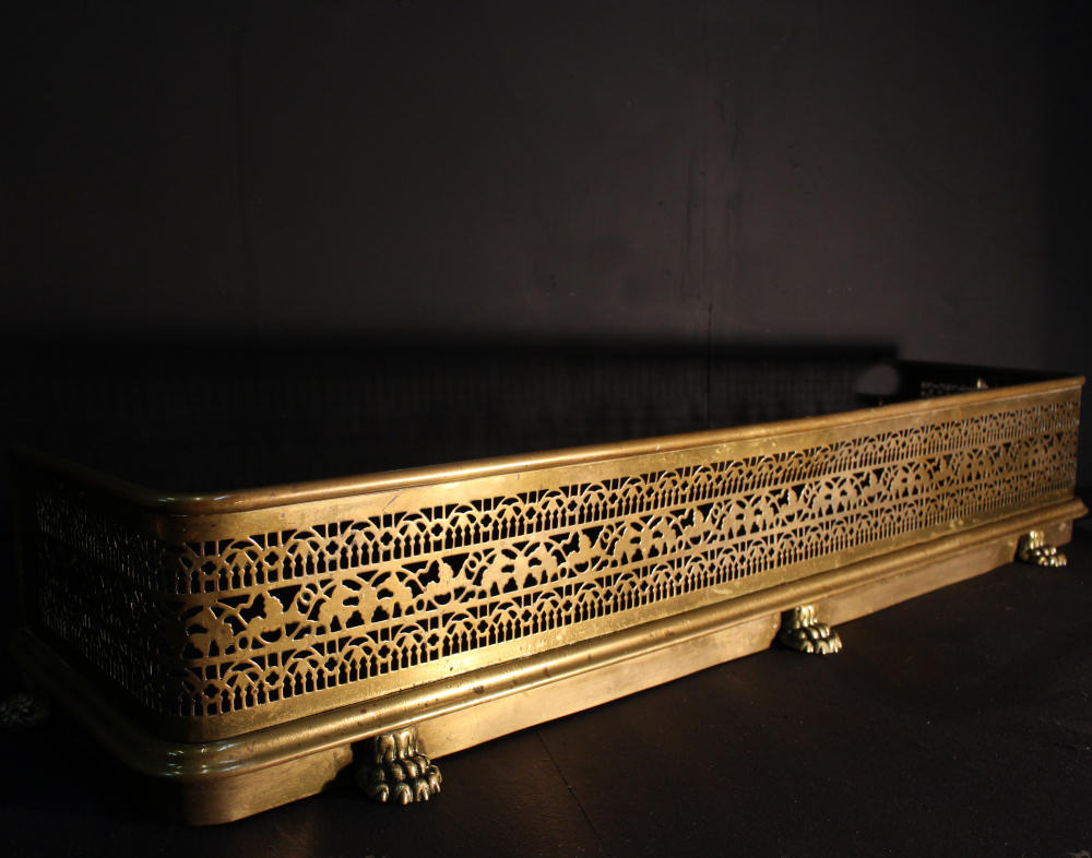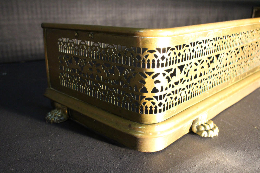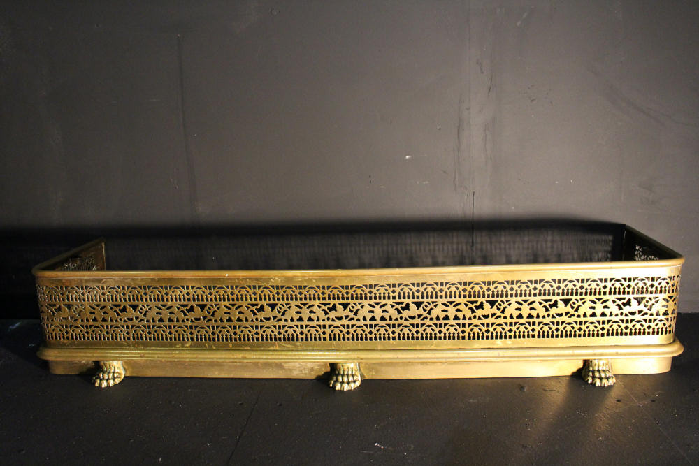 Georgian Brass Fender on Lion Paw Feet A stunning pierced brass Regency Fender (dating to the first quarter of the 19th Century). Raised on 5 lion paw feet with exceptionally well defined claws. Excellent condition with recepticals for pokers. Width 48.75" Depth 13.5" Height 8" |