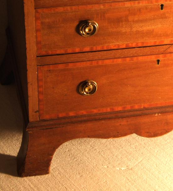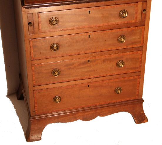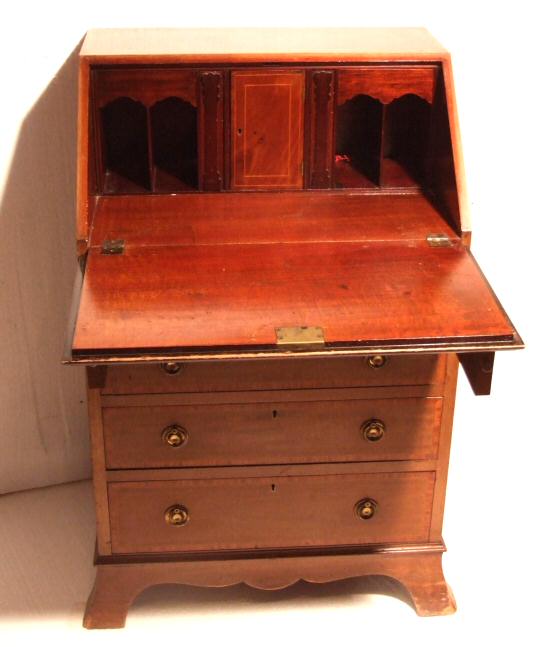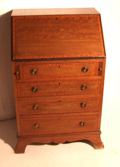 Very small Edwardian mahogany inlaid bureau Of particularly small proportions, being only 24" wide, this beautiful Edwardian mahogany bureau is lined with mahogany, this lovely narrow bureau stands on 4 splayed feet with shaped apron, the drawers and fall all having beautiful satinwood inlay to their surround. The drawers with original pretty circular brass drop handles,the lopers are felt lined and have pretty brass stoppers to their fronts. Internally this piece is beautifully fitted out with central central inlaid sections and various pigeon holes along with 4 hidden compartments for extra storage. A very beautiful antique bureau in lovely condition.