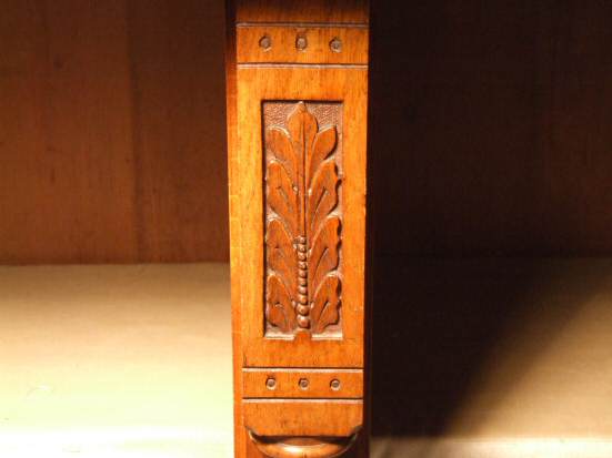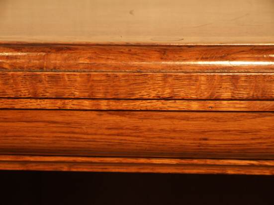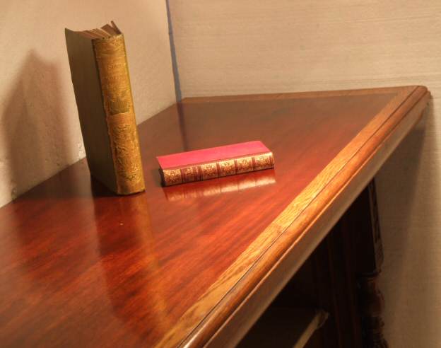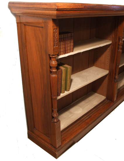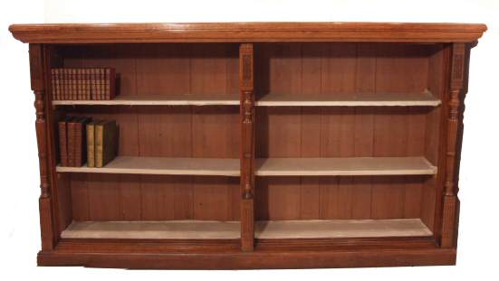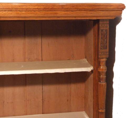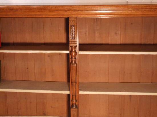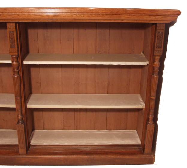 Edwardian large Open Oak Library Bookcase Circa 1900 a very high quality solid oak Library bookcase which comprises of 2 open shelved compartments each with 3 shelves (2 of which each side are adjustable) to the centre and flanking the ends are 3 superbly turned and carved pillasters fluted with square sections to their bases, turned lobed middle sections surmounted by square sections with foliate central leaf panels. The top comprises of a beautifully moulded cornice which contains the highly polished shelf top with inset mahogany panel making this area superb for displaying anything from silver photo frames, trophies to perhaps a model of a pond yatch. The shelf is a very distinctive feature of the bookcase in its own right. The end sections of the bookcase are recessed panels, highly figured and beautifully polished. Overall a gorgeous item of furniture in absolutely stunning condition, fully adjustable shelves (at present lined in cream but will be removed prior to delivery). This bookcase has spent the first century of its life in a Private Girls School in Devon and has been well loved and used daily. H 53.5" Length 95.75" Depth 20.5" (shelf 11") £1,495 (Ref:ST160)