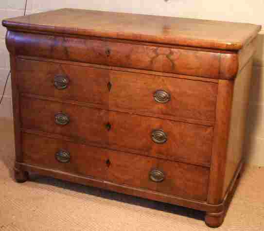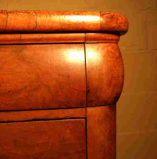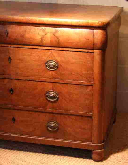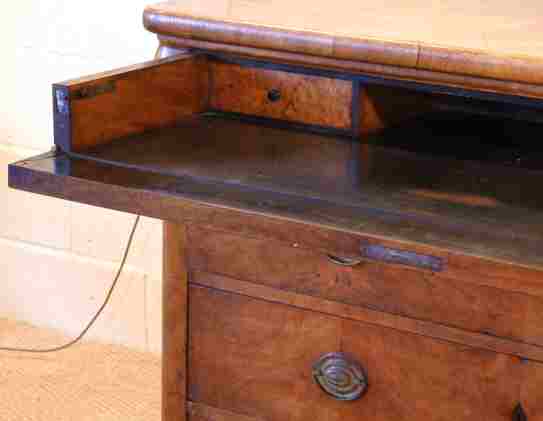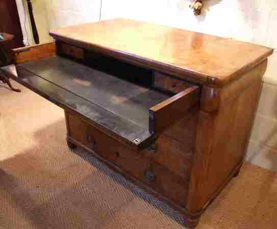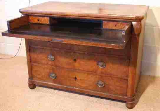 Biedermeir style Early Victorian Burr Walnut Secretaire Chest of Drawers Circa 1840, a superbly figured burr walnut secretaire chest of drawers, comprising of 4 full width drawers, the top drawer with secretaire compartment behind: drawer front folds down to reveal ebonised writing desk area with pigeon hole area flanked by 2 figured walnut veneered drawers. The top and sides of this piece are all bookpaged figured walnut of particularly good grain making this a stunning piece from which ever angle it is viewed from. Features oval brass drop handles, the whole raised on small bun feet. £1,695 (Ref:ST161)
