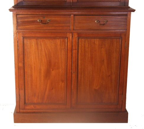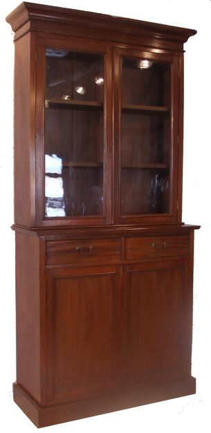Edwardian mahogany Library Bookcase A lovely simple and classic example of an Edwardian mahogany Library bookcase. The lower section comprising of 2 doors with 2 drawers above with attractive brass swan neck handles, with inner shelf and excellent storage space, above which is a glazed upper section with 2 adjustable shelves (providing 3 shelves for storage). This bookcase is a lovely colour and in excellent condition. The whole is raised on a plinth and surmounted by a simple and elegant cornice. This divides into 3 for ease of transport and if you like to store your books in a "glazed" bookcase then this may well be for you. H 85" W 40" D 16" Price £1,650 (Ref:ST167)