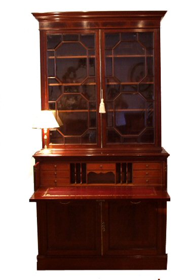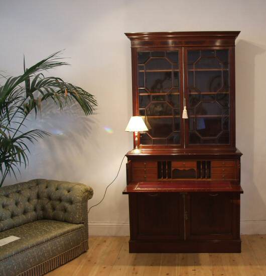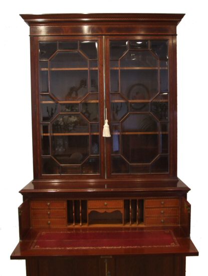 AN EDWARDIAN MAHOGANY SECRETAIRE BOOKCASE Circa 1900, this beautiful antique secretaire bookcase is a lovely deep rich flame mahogany with satinwood inlay to the cornice, the doors and the top surface. The top section consisting of a pair of astragal glazed doors with original bevelled glass and strip of decorative brass, opening to reveal fully adjustable mahogany faced with line inlay shelves which are sturdy enough to take the heaviest of books. The glazed section sits neatly on the secretaire section below, which consists of a pair of mahogany flamed doors with crossbanding to each door, behind which is a deep shelf, which provides a massive amount of extra storage. The secretaire fall, with its wonderful flame mahogany front, has 2 pretty decorative brass handles, now fully buffed, and is provided with a fully working lock and key. The drawer opens to reveal a fully fitted interior with pigeon holes all with chequered line inlay, and small inlaid drawers with beautiful brass handles. The leather skive has been replaced with a new deep burgandy and gilt tooled leather skive making this ready for another 100 years of use. All runners and locks checked and provided in showroom condition this is a beautiful example and one that will give years of pleasure. Height 94" Width 49" Depth 23" SOLD (Ref : ST54) Email Us for a delivery quote : Click Here