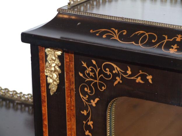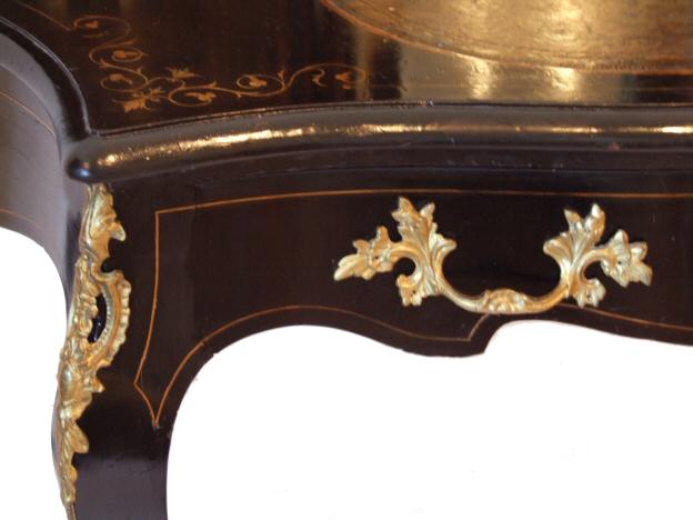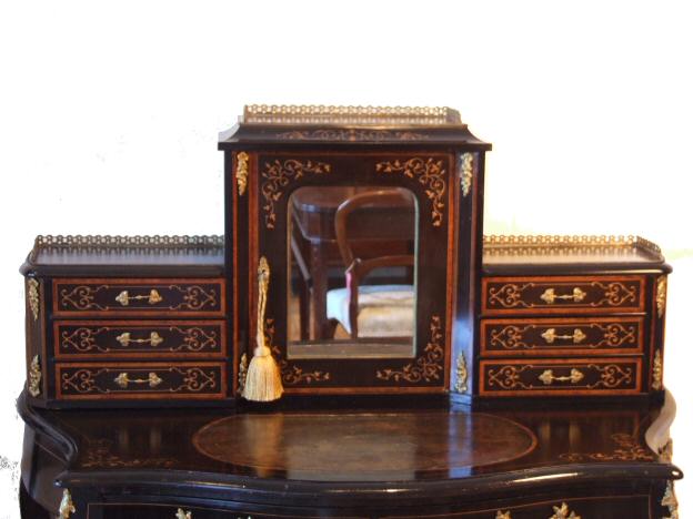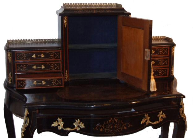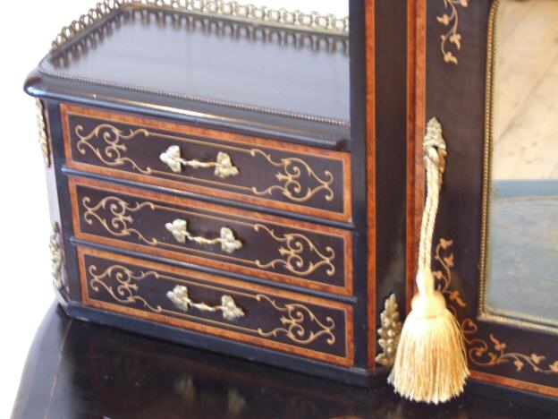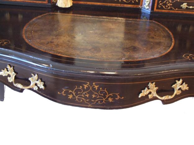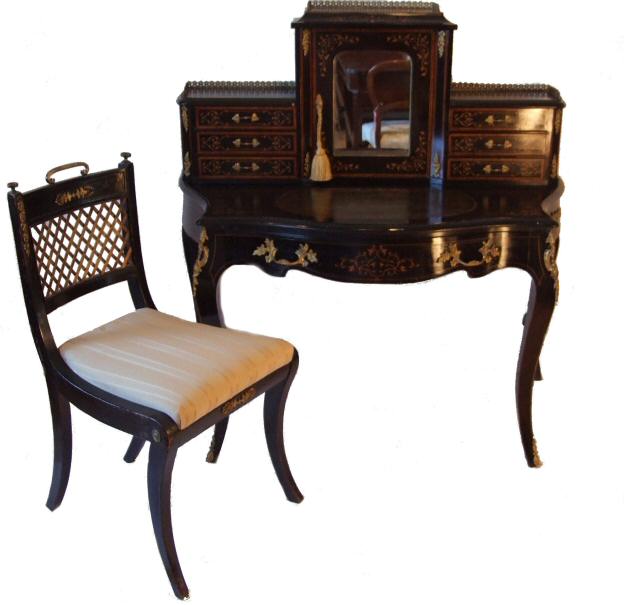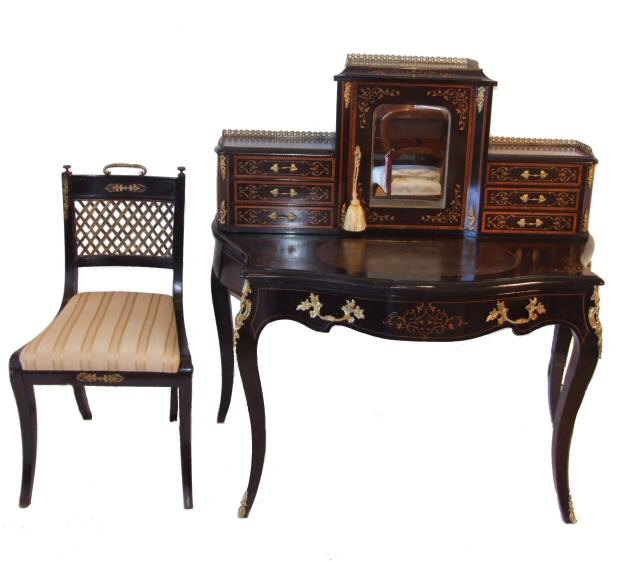 19th Century Ebonised Bonheur-du-jour A beautiful example of a 19th Century Ebonised Bonheur-du-jour with attractive foliate metal mounts, crossbanded and inlaid, the galleried back fitted with six drawers and a compartment enclosed by a mirrored door, having a tooled writing surface over a frieze drawer, on cabriole legs, together with a decorative and matching ebonised chair, having a brass lattice back panel on sabre front legs having been reupholstered in a gold Regency stipe. A beautiful matching set, highly decorative and almost impossible to find as a match these many years on!