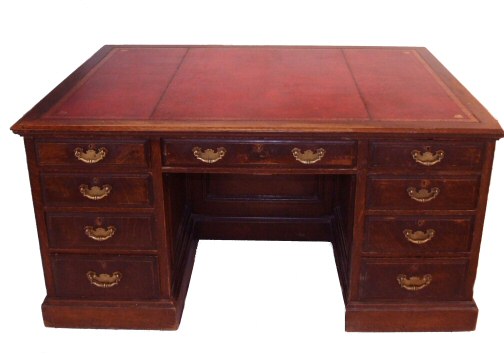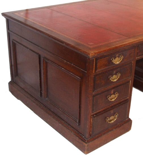Shapland and Petter Edwardian Oak Partners Desk This fantastic Oak partners desk dates to 1900 and is by the highly regarded firm Shapland and Petter of Barnstaple, each lock being stamped with S&P B. It has the usual 9 drawer configuration with graduated drawers all with heavy brass drop handles, the drawer runners having been checked to ensure that they all work smoothly and the locks having been serviced to make sure that the desk is fully lockable. The fielded side panels are attractive and well designed. To the opposing side is a configuration of 3 hinged paneled doors each shelved to a depth of 16" adding even more useful storage space to this already extremely capacious desk. The original red gilt tooled leather inset provides a smooth working surface. The pictures are pre work and the desk will be re photographed once it has made its way through the workshop. Width 60" Depth 45" Height 31" Price £2495