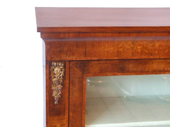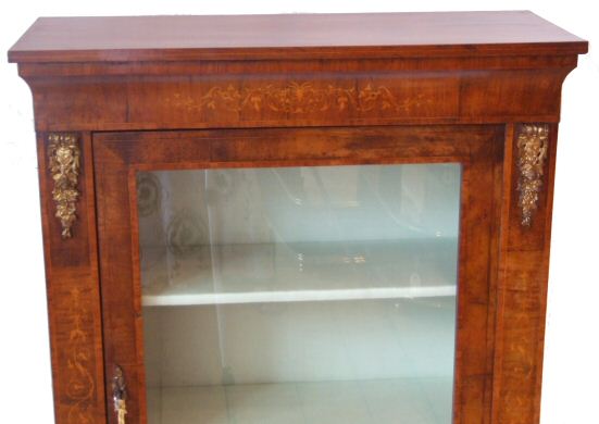 Circa 1880 a Figured Walnut inlaid Pier Cabinet Dating to Circa 1880 a figured walnut inlaid pier cabinet of good proportions. The single glazed door, veneered in figured walnut with boxwod stringing and walnut banding opens to reveal 2shelves. The interior lined in a soft green silk . The cental door is flanked by 4 gilded ormolu mounts of foliate design with inlaid marquetry panels between. Height 41" Width 30.5" Depth 12" Price £995 (Ref :ST87) Email Us for a delivery quote : Click Here