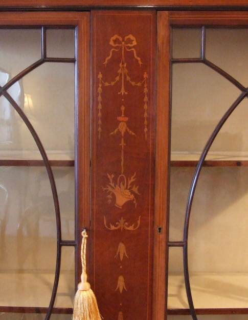 Edwardian inlaid display cabinet An attractive Edwardian inlaid display cabinet dating to Circa 1900, the original glass doors having pretty astragal with central panel ornately decorated with satinwood detail in the form of ribbon swags and bellflowers, the cornice again with similar decoration. The whole raised on slender tapering legs with spade feet. A beautiful example in lovely original condition having the added benefit of the interior being relined in attractive soft gold silk, the 3 shelves giving excellent storage. Lovely! Height 66.5" Width 42" Depth 14.5" Price £995 Email Us for a delivery quote :Click Here (Ref : ST91)