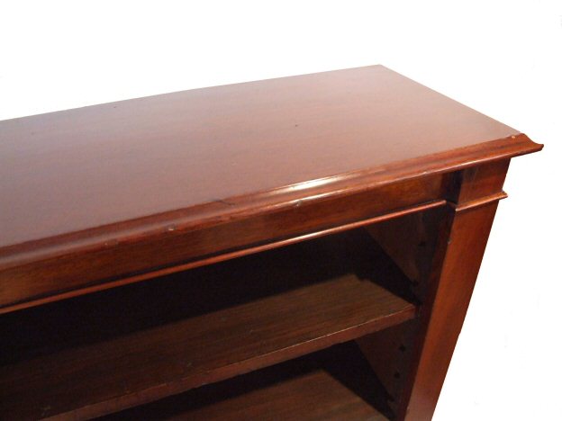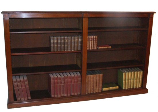 Victorian mahogany double bookcase An impressive Victorian mahogany double bookcase with adjustable shelves comprising of 2 sections divided by a central pillar each with 3 fully adjustable shelves each mahogany faced. Above is a short frieze surmounted by a polished top with thumb moulded edge the whole raised on a moulded plinth.