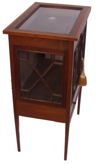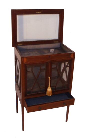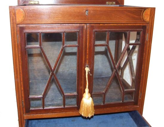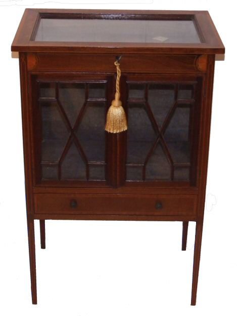 Attractive Edwardian mahogany inlaid vitrine Circa 1900, a particularly attractive inlaid mahogany vitrine. This pretty little piece in excellent original condition comprises of a central astragal glazed display cabinet with satinwood banding to the doors (fully locking) below is a slim drawer with a pair of pretty brass handles again banded in satinwood. Above the mahogany frieze features olive green and amber fan inlays with boxwood stringing behind which is a shallow display section with lift up glazed lid again lined in velvet. The whole raised on fine tapering legs with boxwood stringing. A lovel little item having astragal glazing to both front and sides. Of small proportions. Price to include re-lining in velvet. Width 22.5" Depth 15" Height 34" £995 (Ref:ST95) Email Us for a delivery quote : Click Here