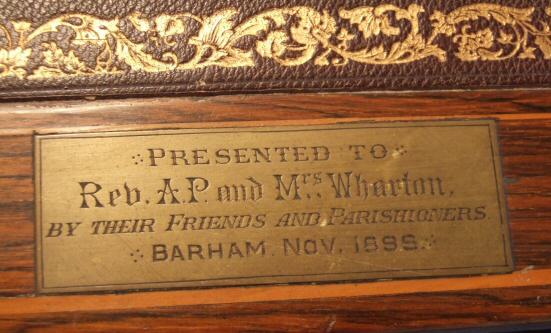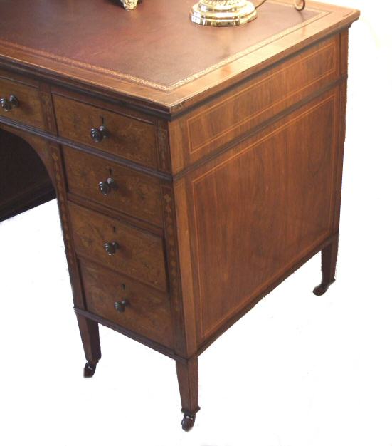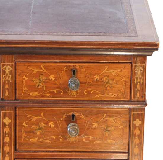 Stunning Decorative Rosewood Victorian Desk with marquetry inlay A stunning example of a Victorian rosewood desk profusely covered in marquetry inlay. The desk comprises of deep central drawer flanked either side by 4 further drawers all covered in wonderful marquetry inlay of foliate design with bellflower decoration to the sides of the body of the desk. Fully locking with attractive brass handles of good quality. The whole stands on 8 slender tapering legs and brass casters. The desk has its original burgandy gilt tooled leather skive in good condition. This is a lovely example and highly desireable in excellent original condition which will be hard to duplicate. There is a small brass plaque at the back of the desk which reads "Presented to Rev A P and Mrs Wharton by their friends and parishioners Barnham Nov 1899" which adds to its history. These photos are pre workshop and will be replaced once this desk has made its journey through our workshop. Height 30" Width 45.25" Depth 25" £3000 (Ref:ST96) Email Us for a delivery quote : Click Here