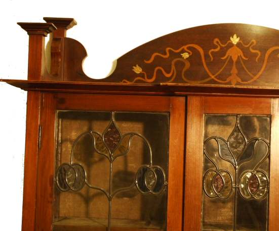 Beautiful Stained Glass Art Nouveau display cabinet Circa 1895 - 1905 a stunning example of a stained glass mahogany Art Nouveau display cabinet. A particularly good example profusely inlaid on the pediment depicting bellflowers and trailing ribbons in amber and green inlay, the flowers in contrasting irredescent mother of pearl. The cabinet features a breakfront outline comprising 3 stain glass panels, the centre panel fixed flanked by 2 opening doors each with their own lock and key and original cast brass foliate drop handles. The floral stylised glazing contained within delicate lead work with the flowers in contrasting ambger and ruby red and blue and shades of green. The 3 shelfs in original, now faded, silvery blue velvet (can be replaced if required). The whole raised on square supports with large undertier polished shelf. The whole in excellent original condition and a particularly beautiful example. Height 65" Width 42" depth 15.5" Price £1,175 (Ref:ST98) Email Us for a delivery quote :Click Here