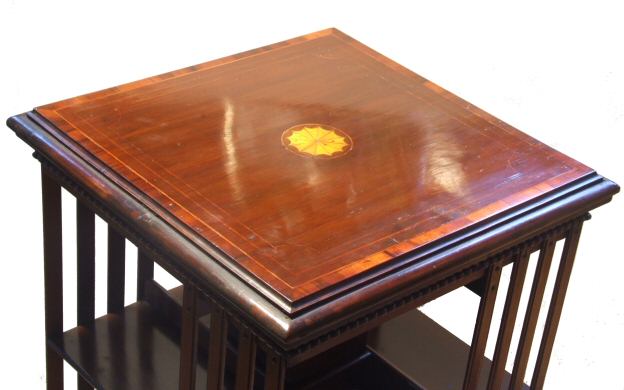 Circa 1900 an attractive Edwardian inlaid mahogany revolving bookcase. Circa 1900, this attractive inlaid mahogany revolving bookcase is a lovely example, featuring 2 open shelves with decorative slats to the corners. Above and below is a molded plinth and cornice, the top with satinwood line inlay and central satinwood motif. The whole raised on 4 splay base with brass and ceramic casters. A lovely item of furniture perfect for book storage where space is a premium. H 29" Width 19.75" Price £495.00 (Ref:ST150)