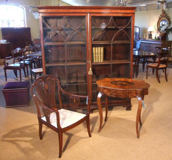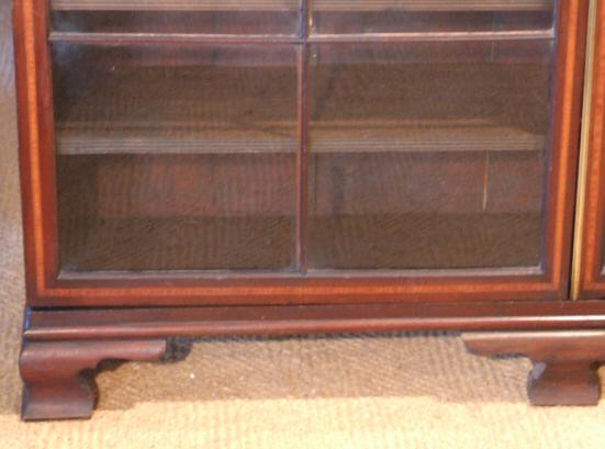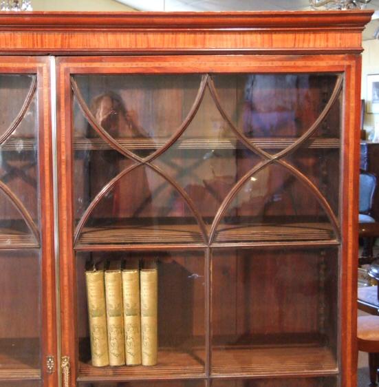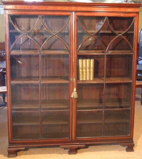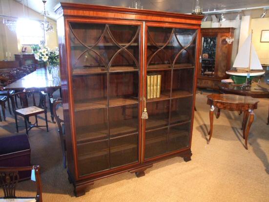 Large Edwardian mahogany inlaid glazed bookcase Striking large Edwardian mahogany inlaid bookcase with 5 large adjustable shelves, the whole a lovely rich colour with thick satinwood banding with original glazed astragal doors, fully locking with working key attractive brass strip to the door, the whole raised on 3 sturdy bracket feet. A lovely large antique bookcase suitable for storing a massive amount of books...these dont come up very often so be quick! Height 71" Width 62" Depth 14" £1650 (Ref:ST154)